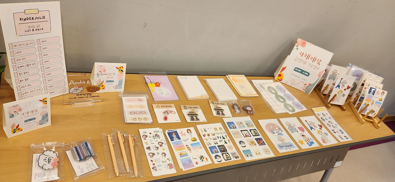 그러나 킨더줄리의 야심 찬 첫 전시회는 아주 조용히 마치 경건하게 이루어졌다. 대부분이 어린아이들을 키우는 엄마들이다 보니, 일단 소통하는 시간도 제각각이었다. 그리고 아이들에 집중하다 보니 아마도 카톡을 보는 시간도 쉽지 않았으리라. 돌이켜보면 나도 그랬다. 카톡을 읽었지만 대답할 시간조차 없던, 그런 나날들이 많았다. 그리고 킨더줄리의 커뮤니티 속성 상, 막 나서는 사람들이 없어서 그런지 다들 조용조용하게 자기 할 일을 묵묵히 하는 스타일인 것 같다. 조용하지만 정말 신기하게도 전시회 작품 하나하나가 반짝 반짝 빛이 났고, 기부를 하기 위해 만든 굿즈들 또한 너무나 따뜻하게 느껴졌다. 과연 전시회를 제때 할 수 있을까? 살짝 걱정도 되었었지만, 그 걱정은 기우였다. 비록 많은 소통을 하지는 않았지만 각자의 자리에서 아름다운 글 그리고 그림으로 기록하고 있었고 전시회장을 반짝반짝 빛나게 해 주었다.