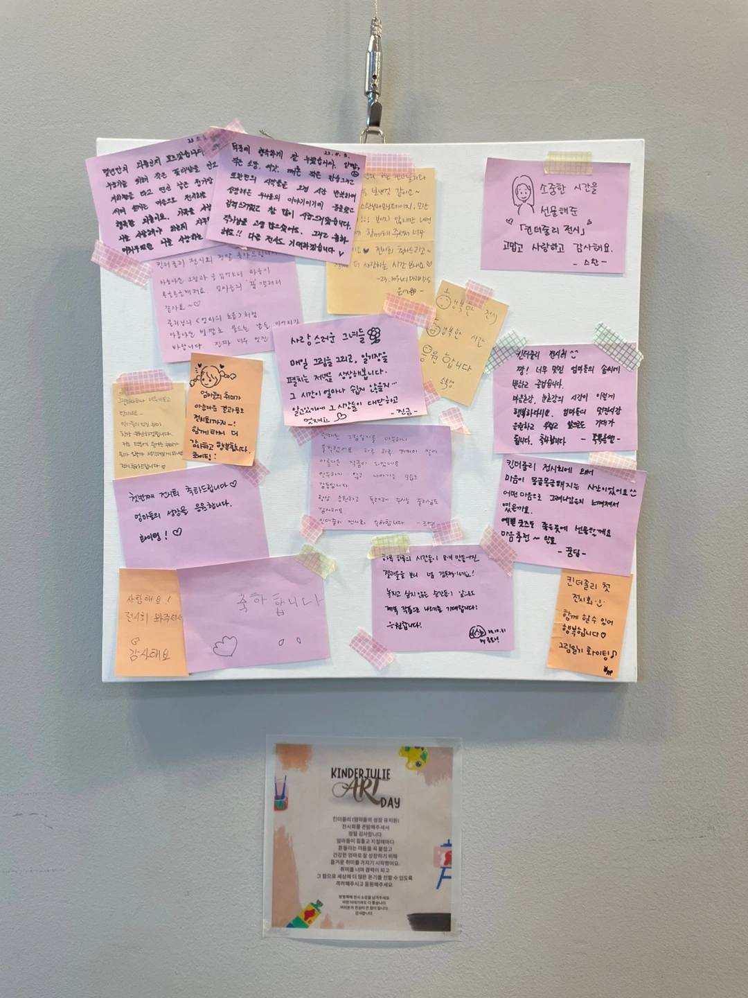 나는 성당에서 어린이 교사라는 봉사를 하면서 느낀 것이 ‘내가 무엇인가를 주려고 봉사를 시작했지만, 결국 돌이켜보면 내가 준 것보다 받은 것이 훨씬 더 많다’라는 것이었다. 사실 이번 킨더줄리 전시회 또한 많은 분들이 나에게 고맙다는 인사말씀을 주셨지만, 나는 오히려 더 감사한 시간이었다. 일단 그림일기 책을 만들기 위해 800일간의 그림일기를 다 하나하나 다시 보는 시간을 가졌는데, 새삼 놀라웠다. 내가 이랬나? 싶을 정도로 마치 다른 사람의 일기를 훔쳐보는 느낌이었다. 그러면서 그동안 내가 많이 성장했음을 느낄 수 있었다. 그리고 800일의 시간 동안 함께 추억을 쌓아온 메이트님들께도 감사한 마음이 들었다. 매일 그림일기를 공유하며 메이트님들의 응원이 지금의 나를 만들었다는 것을 다시금 깨달았다. 아, 나는 이렇게 애정 어린 관심과 따뜻한 응원이 필요했었구나. 그리고 그 사랑을 받고 이렇게 성장할 수 있었다는 것을. 비록 나도 아직은 부족한 존재이지만 메이트님들에게 더 마음을 다해야겠다고 다짐했다. 나도 다른 이에게 조금이나마 나눌 수 있는 에너지가 있다면 기꺼이 메이트님께 나누어주고 싶다는 마음이 더 강해졌다.