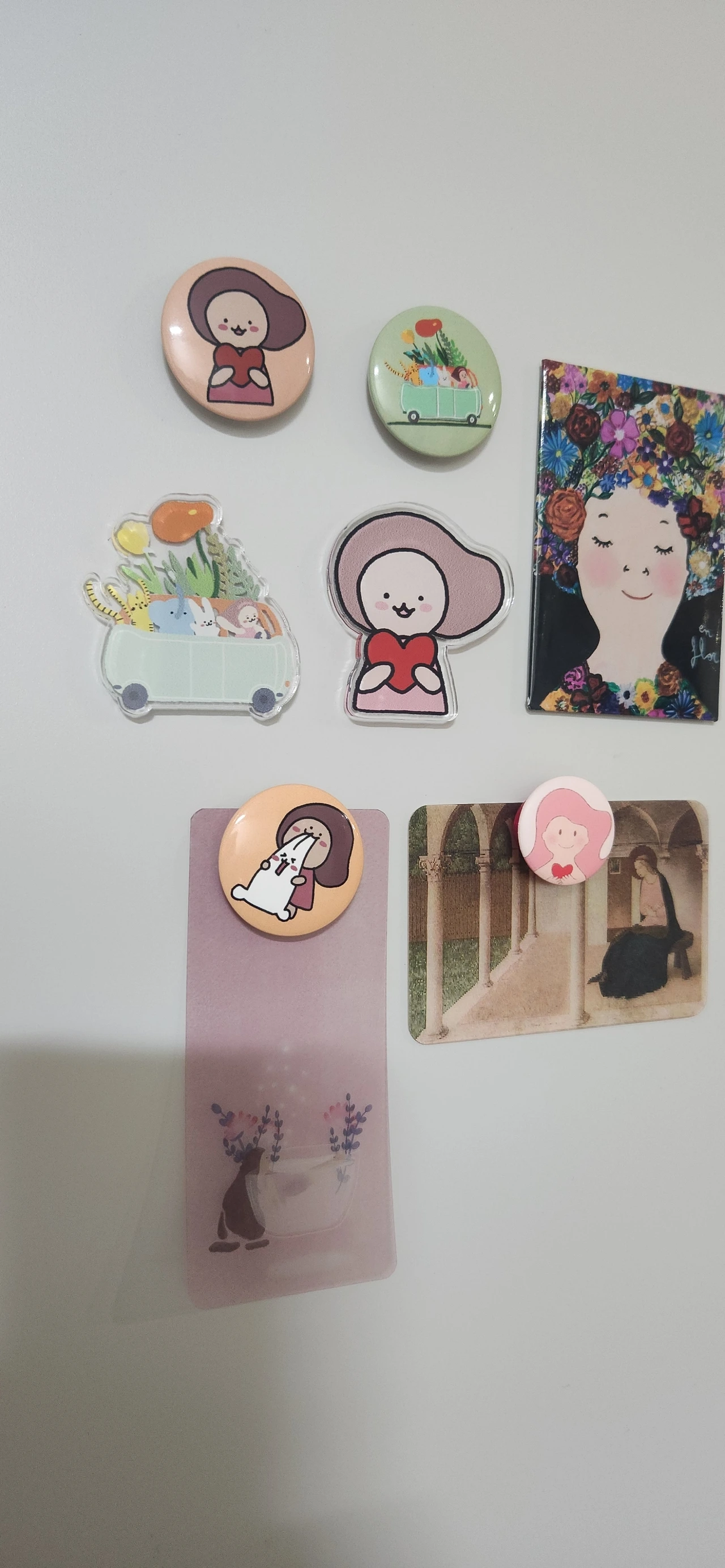 이 외에도 냉장고나 요즘은 사무실 파티션 등에 붙이는 자석도 이것저것 다른 스타일로 만들어 보았다. 이제 뭘 더 만들어야 할까 고민이다. 제일 어렵다는 스티커는 뒤로 미루고 있고 포스트잇이나 떡메를 해야 하나 고민인데, 사실 내가 잘 쓰지 않아서 그런지 자꾸 뒤로 미루게 된다. (혹시나 갖고 싶은 굿즈가 있으면 댓글 남겨주시면 도전해 보겠습니다.ㅎㅎㅎ)