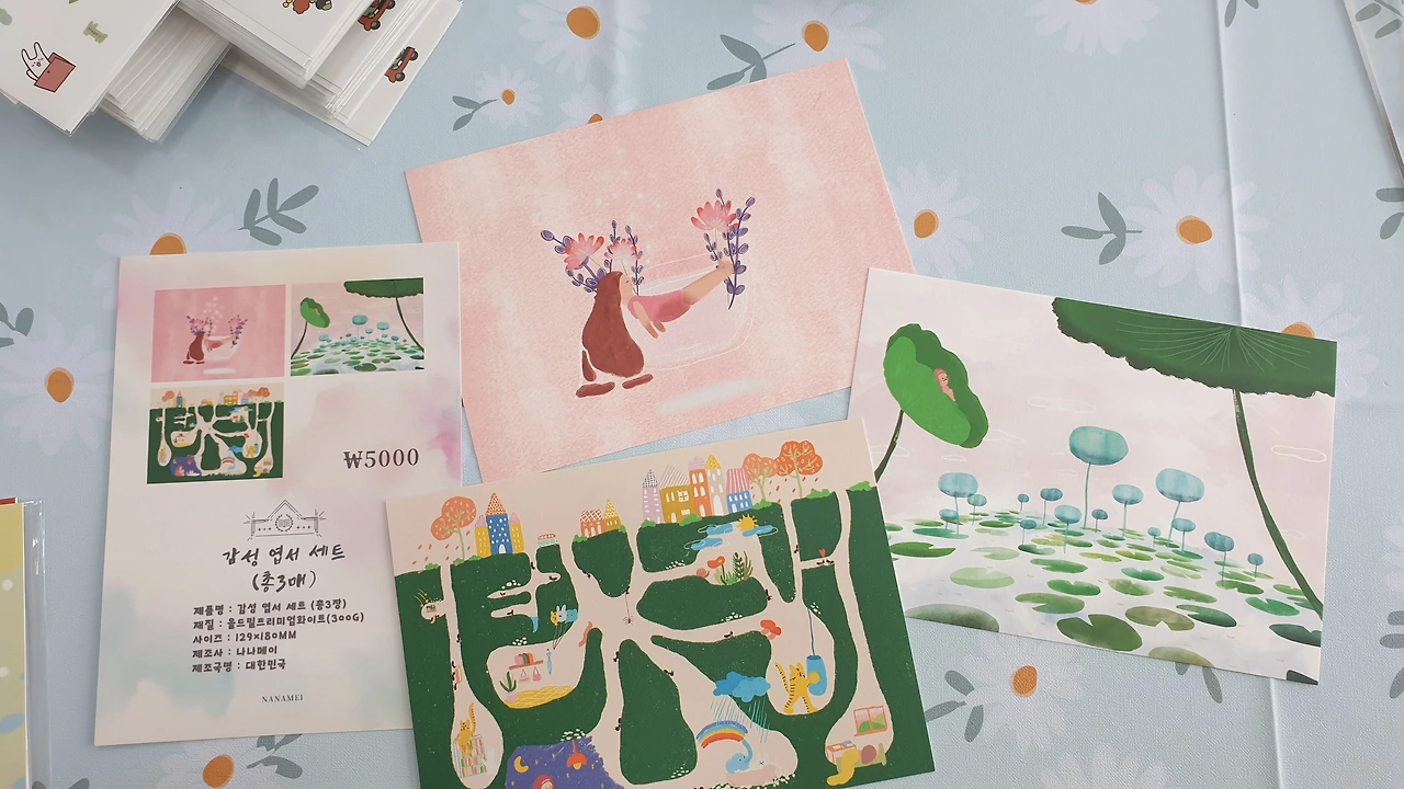 키링만 해서는 구색을 맞추기 어려우니 더 다양한 것들을 만들어 보기 시작했다. 내 그림 중 엽서로 하면 이쁠 것 같은 아이들을 골라 주문해 보았다. 그리고 페어에 같이 나가는 친구가 마침 사는 지역에서 마켓을 연다고 해서, 나의 엽서를 그쪽에서 먼저 팔아볼 수 있었다. 다행히 반응은 나쁘지 않았고 지금까지 몇 장 팔리고 있다는 기분 좋은 소식을 들을 수 있었다.
