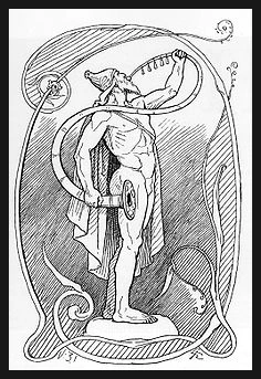 - 뿔나팔을 부는 헤임달, 로렌츠 프로리히(1895, 출처 : https://en.wikipedia.org/wiki/Heimdall)