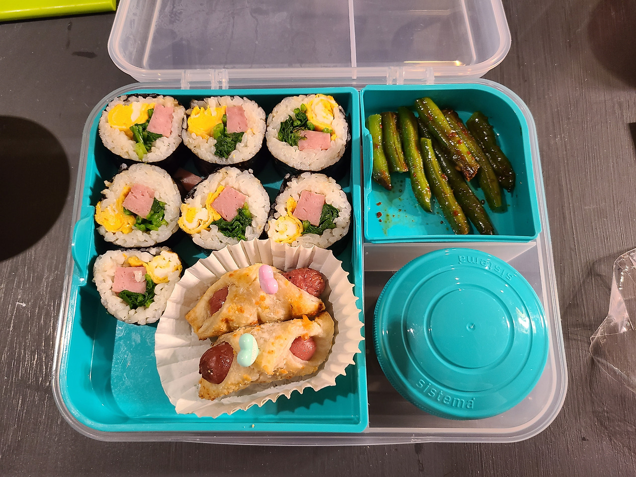 #김밥, #그린빈 볶음, #소시지 파이, #손으로 뜯은 수제? 오렌지, #단풍 쿠기, # 망고주스까지 칸칸이 엄마의 마음이 느껴지길 바라며 꽉꽉 채웠다.
