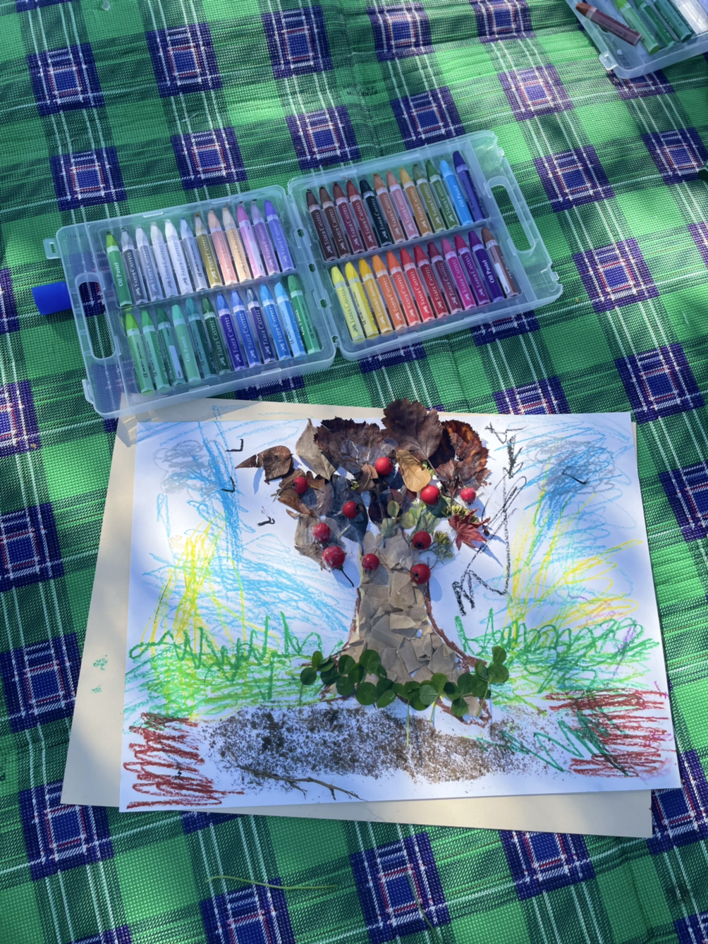 자 이제 좀 돌아다니고 싶지? 그래 딸아 엄마가 널 안다. 우리 공원에 있는 낙엽이랑 열매 주으러 갈까? 다행히 잔디밭 위에 낙엽과 열매가 많았다. 딸은 즐겁게 여기저기 주워와서 보여준다. 오구오구 잘했어요~. 그렇게 모아 온 재료로 붙이기 놀이를 했다. 다행히 작은 나뭇잎들은 풀에 딱 달라붙었다. 열매는 그냥 스카치테이프로 붙였다. 내가 열매 줄기에 테이프를 붙여주면 공주님이 톡톡 하고 그림에 붙이고 모자란 부분은 함께 붙여줬다. 이렇게 나무의 잎들과 기둥이 만들어졌다.