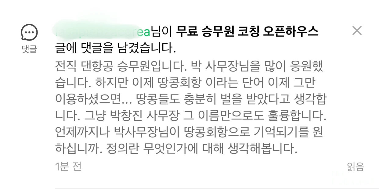 참 이런 생각을 신념으로 믿는다면 안타까운 사람인 것이고 혹은 아직도 대한항공과 그 재벌 일가의 부하들이 벌이는 짓이라면 더 한심한 일이다.