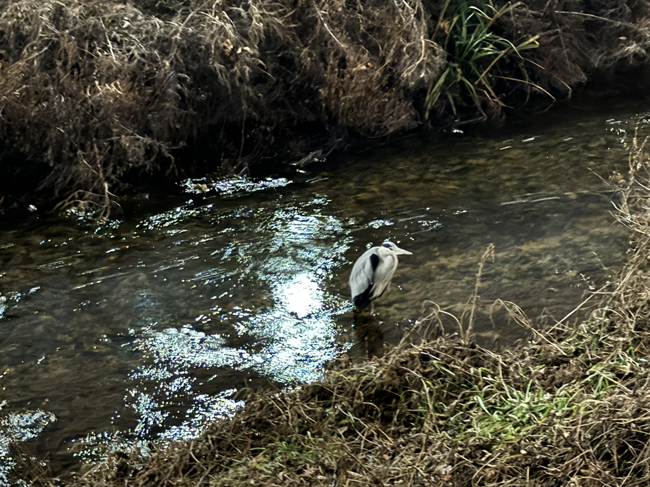 어두운 저녁 밤 동네를 순찰하는 손전등 불빛에 큰 새도 작은 오리 무리들도 위협을 느꼈는지 떠나버렸다.