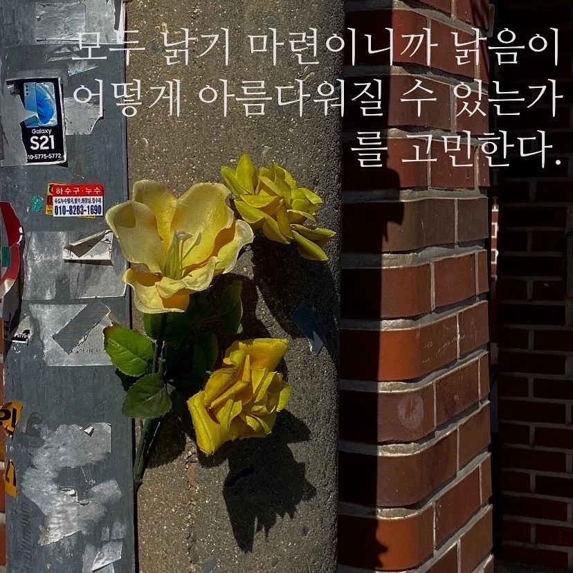 하수구 옆에 조화가 하나 떨어져 있었다. 걸어가다 보니 한 할머니가 다른 꽃을 주웠는지 집 앞 전봇대 사이에 꽃을 꽂아두고 있다. 빠지지 않게 눌러 넣고 꽃잎이 잘 보이도록 펼쳐놓았다.