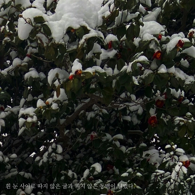 흰 눈 사이로 따지 않은 귤과 피지 않은 동백이 널렸다. 이름을 모르겠는 갈색 새들은 콩콩 뛰며 나무 위의 눈을 털어내고 햇빛이 비치자 눈들이 툭툭 떨어진다.