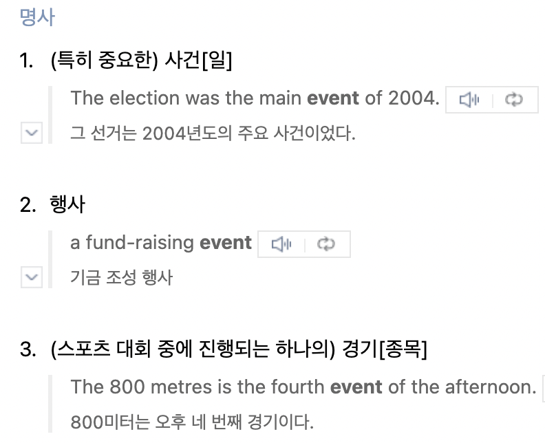 한영사전에 Event를 검색하여 정의/예시를 읽어보자.