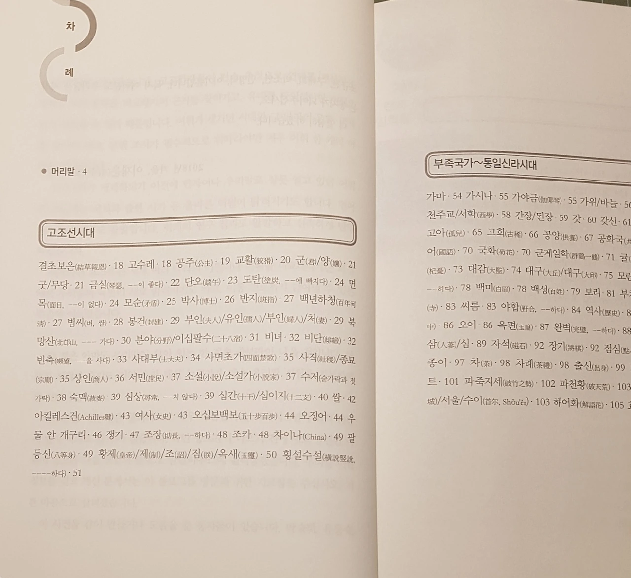 머리말을 지나 차례를 보면, 우리나라 역사를 기준으로 시대별로 나눠 단어를 분류한 것을 알 수 있다. 여기에서 놀라웠던 것은 고조선이라는 아득히 먼 옛날부터 이어져 내려온 단어가 꽤나 되었다는 사실이다. 무려 서기 2333년 전에서 108년 전에 해당하는 기원전부터 뚜렷하게 이어져 내려온 단어가 이렇게 많다는 것에 놀라움을 금치 못했고 그 내용이 너무나 궁금해졌다.