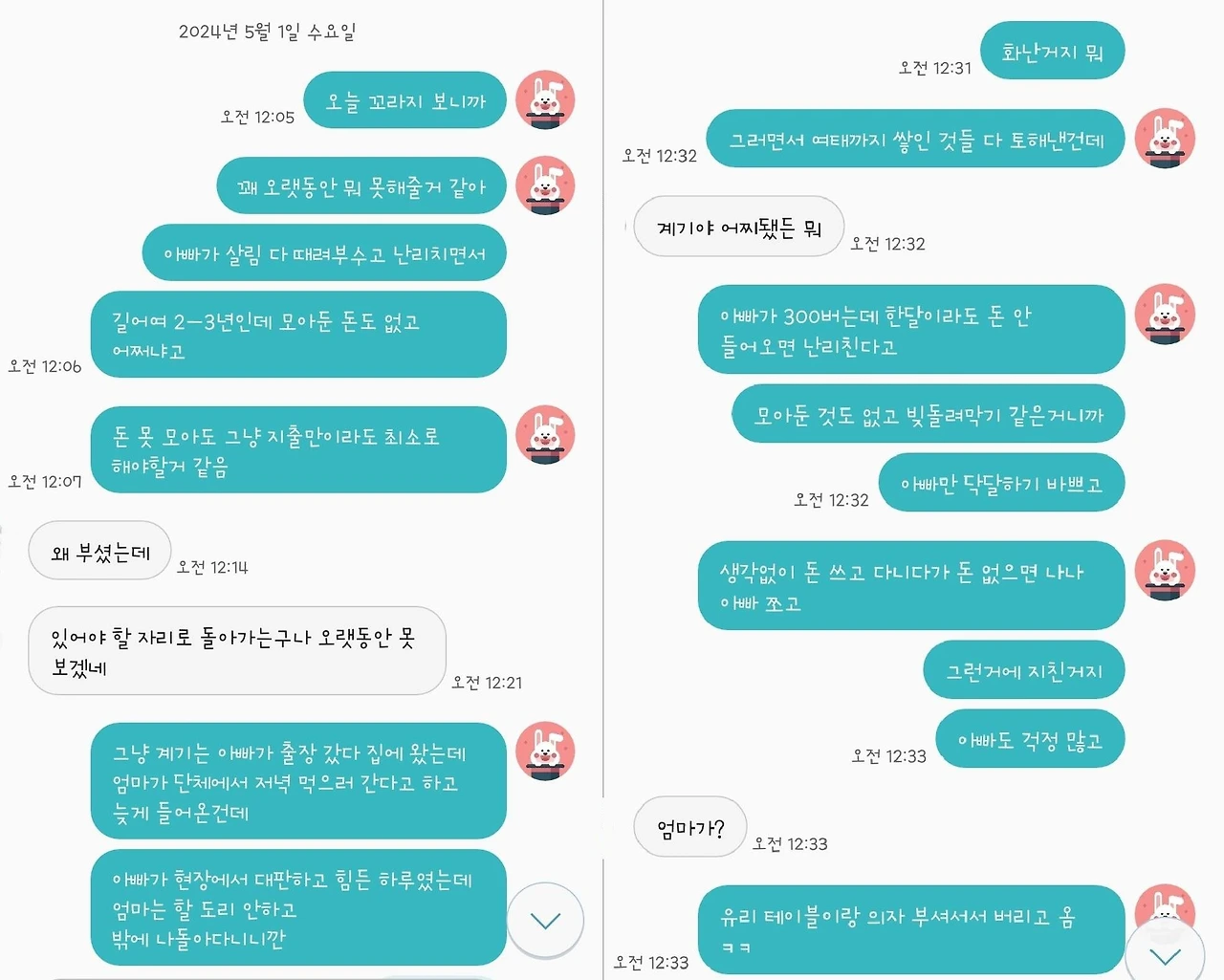 퇴근 후 집에 오니, 먼 지방에서 객지생활로 일을 하셔서 평소에 평일에는 볼 수 없던 아버지도 근로자의 날로 인해 올라오셔서 계셨다. 다만 내가 퇴근을 했을 때까지도 엄마가 집에 없어서인지 상당히 언짢아 보였다.