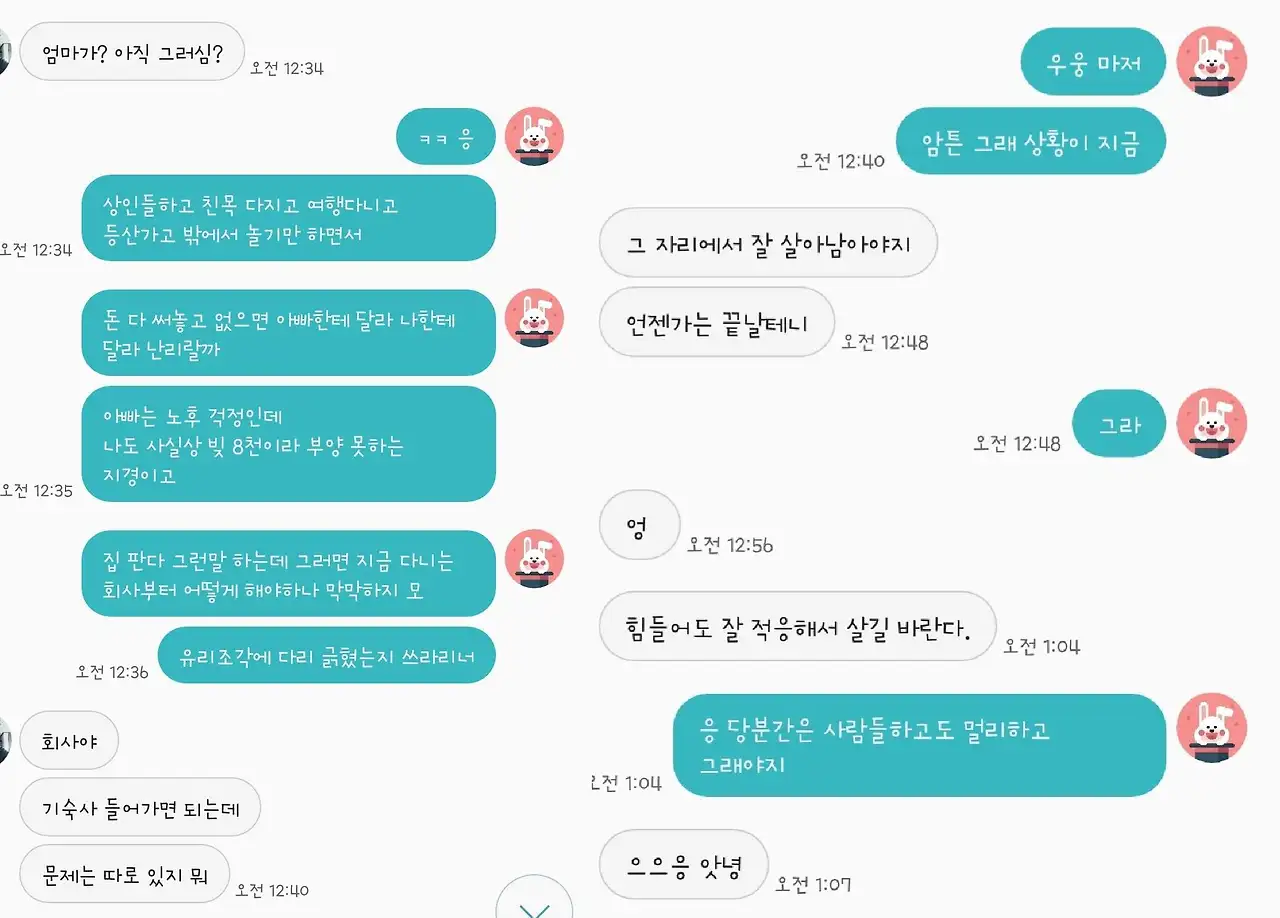 내 처지로 인해 당분간은 도와주기 힘들 것 같다는 상황을 알리기 위함이었다. 내 처지와 상황에 대해서 너무나 비참하고 좌절스러운 마음이 들었기 때문에 이런 마음이 티가 날까 봐, 그리고 괜히 내 짐을 얹어주기 싫어서 일부러 더욱 말투를 가볍게 하고 별 거 아니라는 듯이 말을 했다.