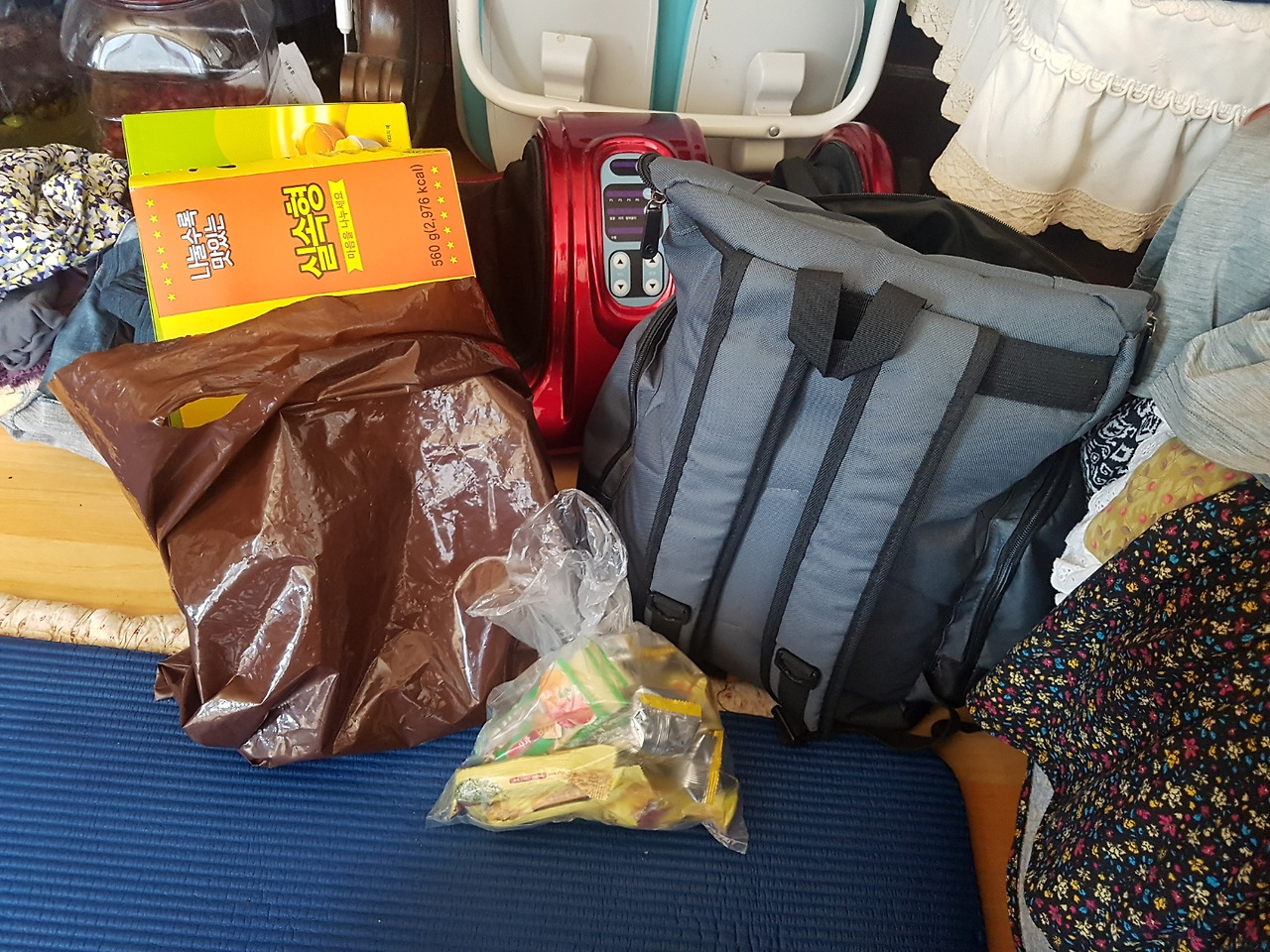 늘 옷가지 등을 넣어 들고 다니시는 가방을 두고 가끔 다른 짐도 같이 놓으신다. 그때그때 다르기도 하고 없는 날도 있는데, 거기엔 주로 숙소에서 남은 것들이나 받은 물건들, 과자 같은 것이다.