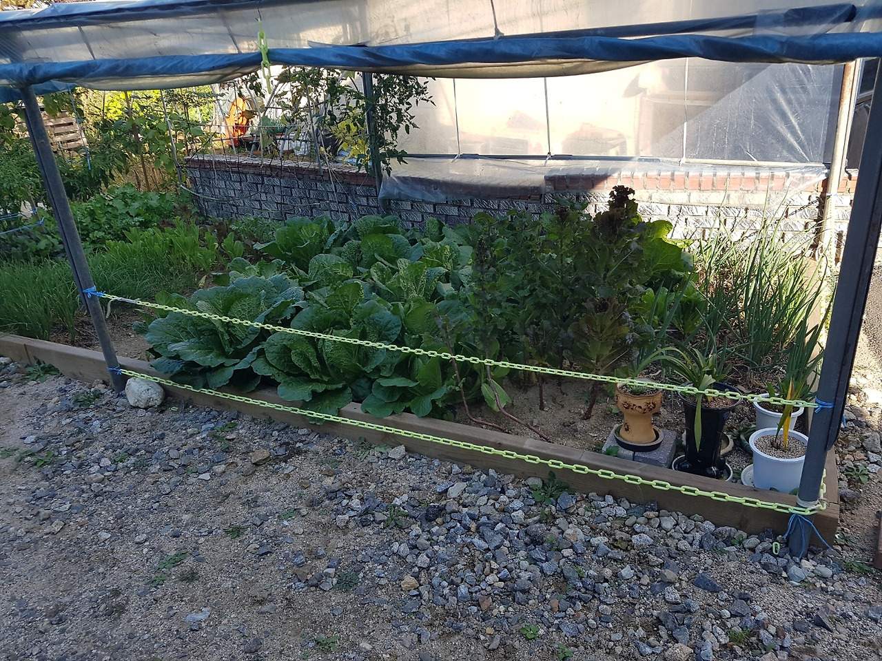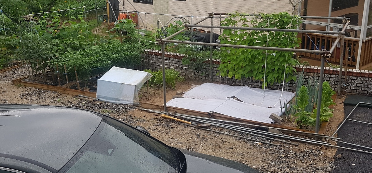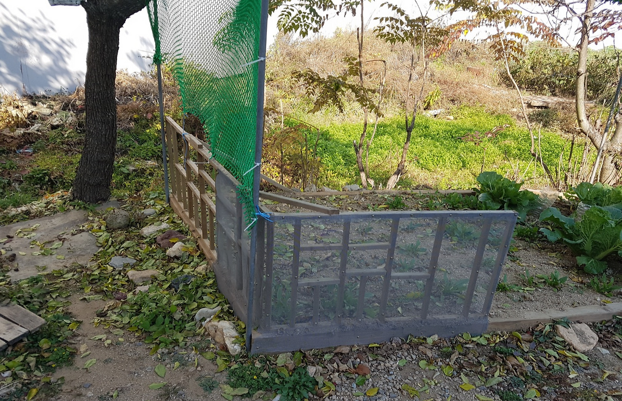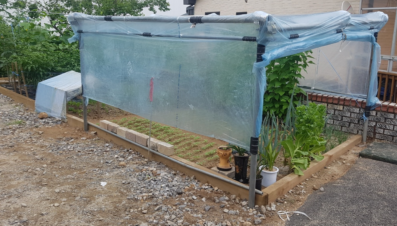 시간이 어느 정도 지나, 밖엘 나가보니 어느새 텃밭 주변에 이렇게 쇠파이프로 구조물이 하나 만들어져 있었다. 그리고 여기서 시간이 좀 더 지나고 나서 다시 보니, 그 구조물엔 다른 것들이 덧대어져 어느새 완성되어 있었다. 완성품의 정체는 처음에 뼈대를 봤을 때 어렴풋이 예상했던 것이었다.