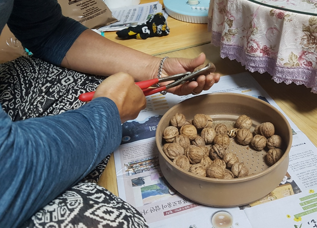 집 청소 및 보수, 마당일, 장보기, 채취까지 이미 많은 일을 하시는데도 외출에서 돌아온 오후나 저녁 시간에도 또 할 일은 있다. 매번은 아니지만 어디선가 사 오던가 이웃 등으로부터 얻어오신 농작물들에 대한 껍질 까기나 다듬기 등을 하신다. 저번에는 엄마가 베란다에 내놓은 호두를 가져와서 아버지에게 까달라고 해서 아버지가 tv를 틀어 놓은 와중에 거실에서 열심히 껍질을 까시더랬다.