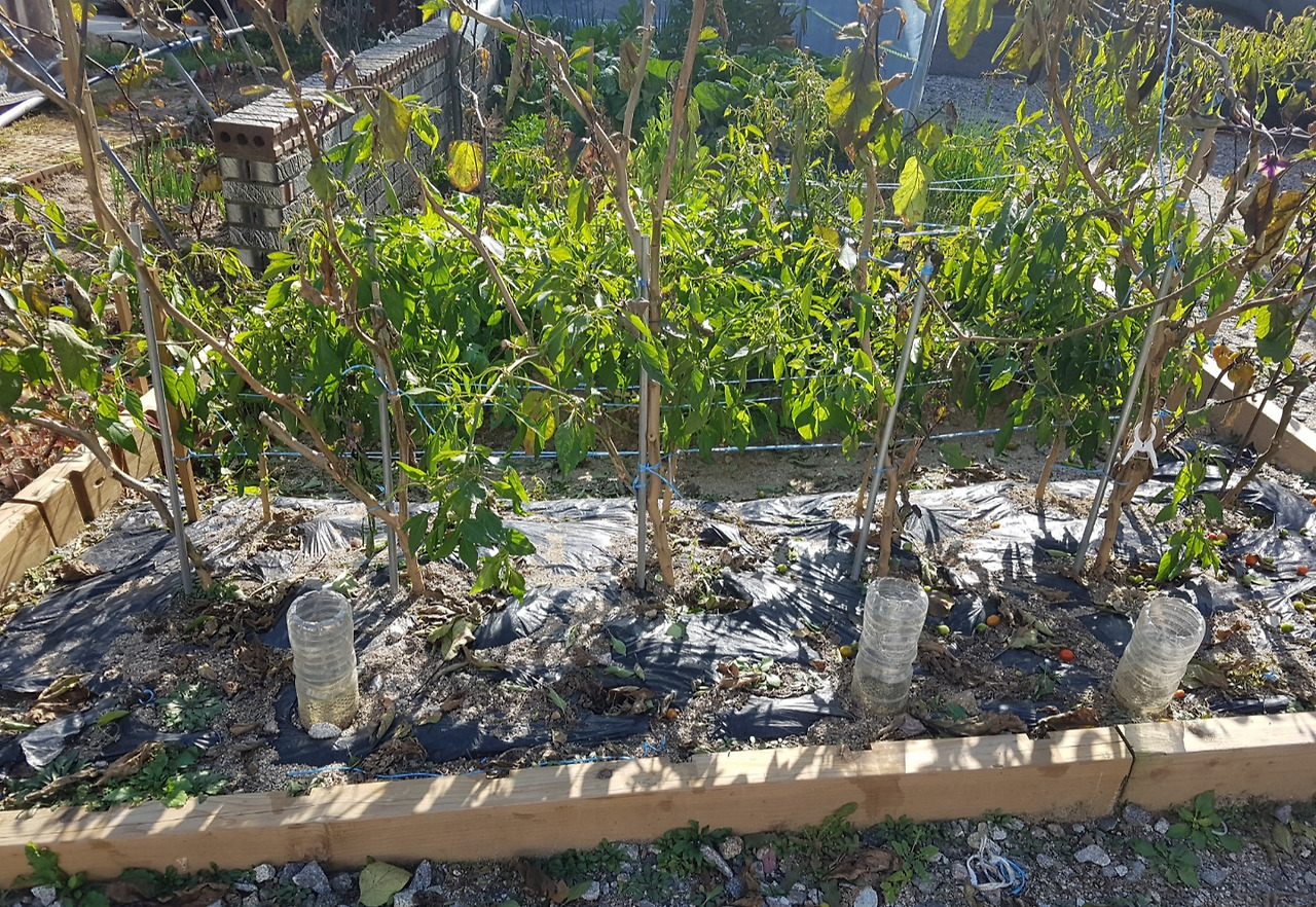 나무 조각으로 텃밭의 가장자리를 만들고 농사용 까만 비닐을 깔아 둔 곳에 놓은 빈 페트병에서 아버지의 재활용 정신이 엿보인다. 직접 물을 뿌려 주면 빨리 마르기 때문에 서서히 물을 주기 위해 만드신 거라고 했다. 그 덕분인지 어느새 잘 자라난 고추이다.