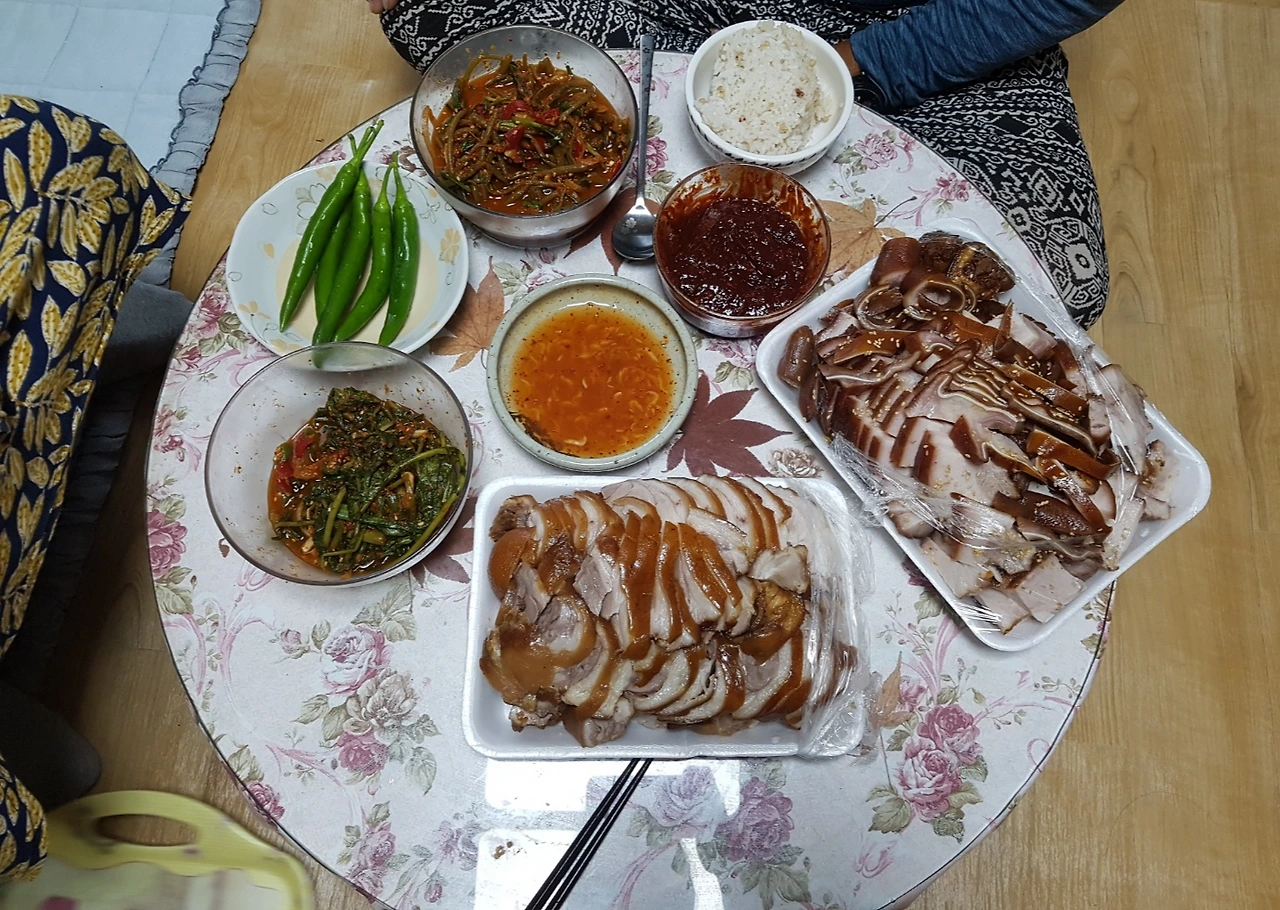 저번에는 맛있는 곳이라며 청량리까지 가서 족발도 사 오셨다. 사다 달라는 말을 하진 않았는데도 순전히 맛있는 걸 가족들이랑 같이 점심으로 먹기 위해 멀리까지 다녀오셨다. 집 반찬과 텃밭의 고추와 함께 먹었다.