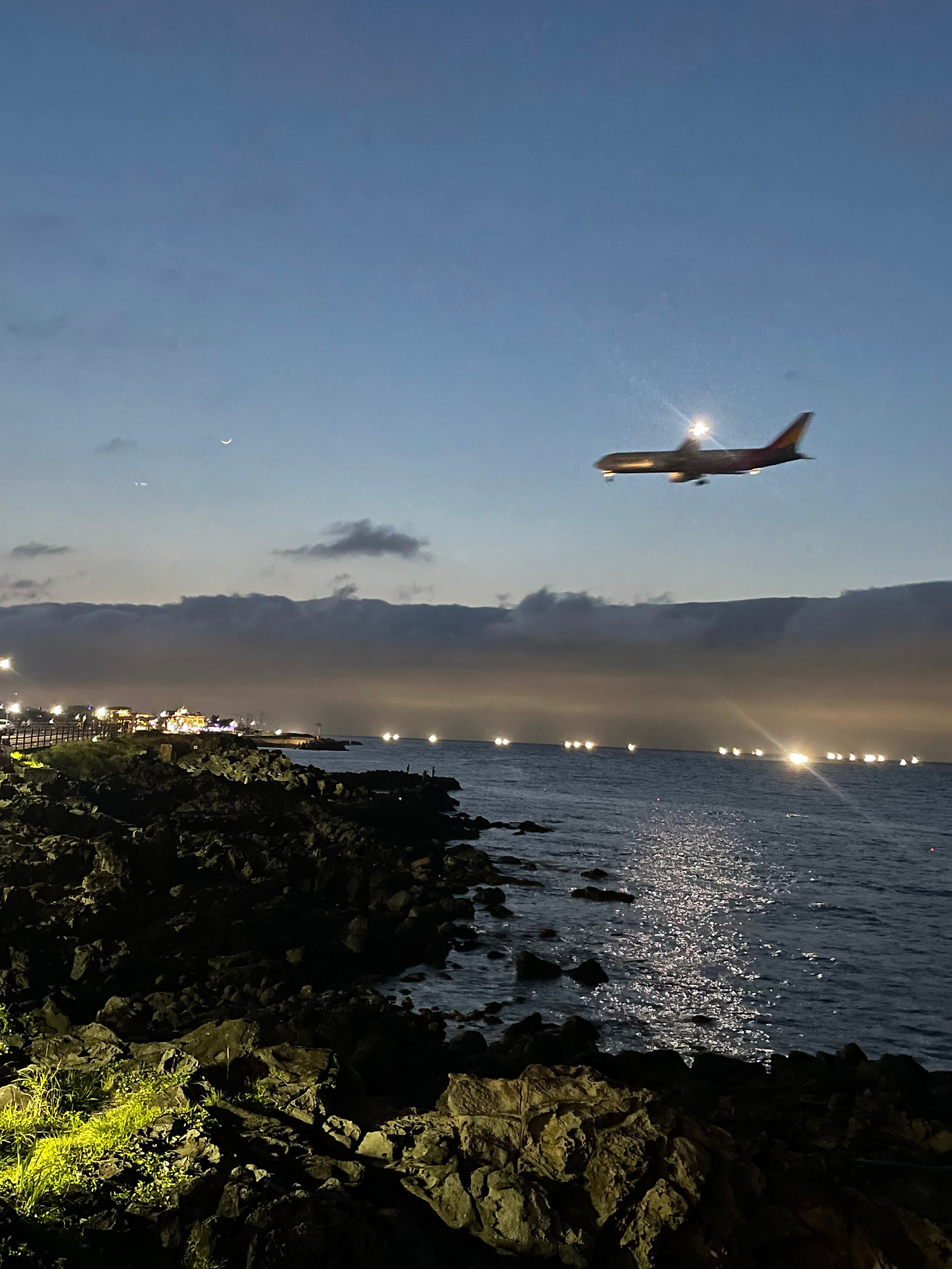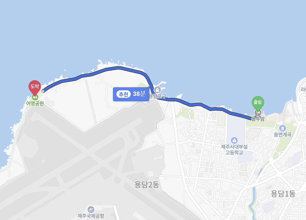 제주 공항 근처에 있는 게스트하우스(이하 게하)에 머무를 때는 바로 앞에 있는 해안도로를 많이 걸었다. 용두암에서부터 용마마을 정류장을 지나 어영공원까지 아침마다 뛰거나 저녁때 산책을 나가면서 게하에서 지내는 동안 이 해안도로에서 보낸 시간이 가장 많았다. 특히 여자친구랑 이 도로를 걸으면서 서로를 알아가면서 사랑의 싹을 틔웠다. 이 도로는 비행기가 많이 지나다녀서 사람들이 사진을 많이 찍는 것을 볼 수 있다. 비행기가 많이 지나다닐 때에는 10분에서 15분 사이에 한 대씩 지나가고는 한다. 처음에는 신기해서 나도 따라 인증샷을 찍었지만 나중에는 비행기 소음이 심하다 보니 잘 들리지 않는 곳으로 피해 다닌다. 그래도 이때 처음 제주살이를 오면서 설레했던 감정과 아침마다 바다를 배경으로 파도 소리를 들으면서 러닝을 하던 나를 추억한다.