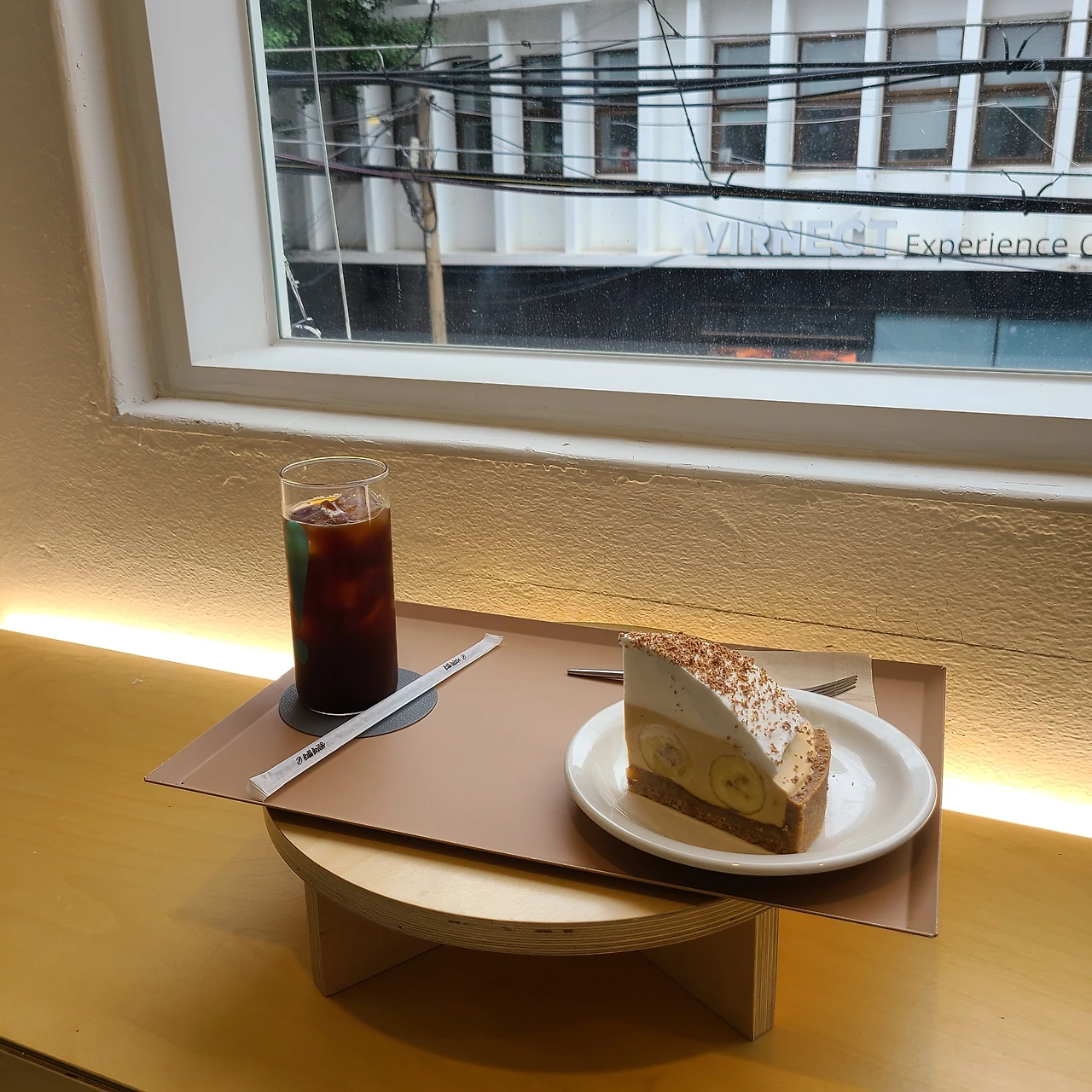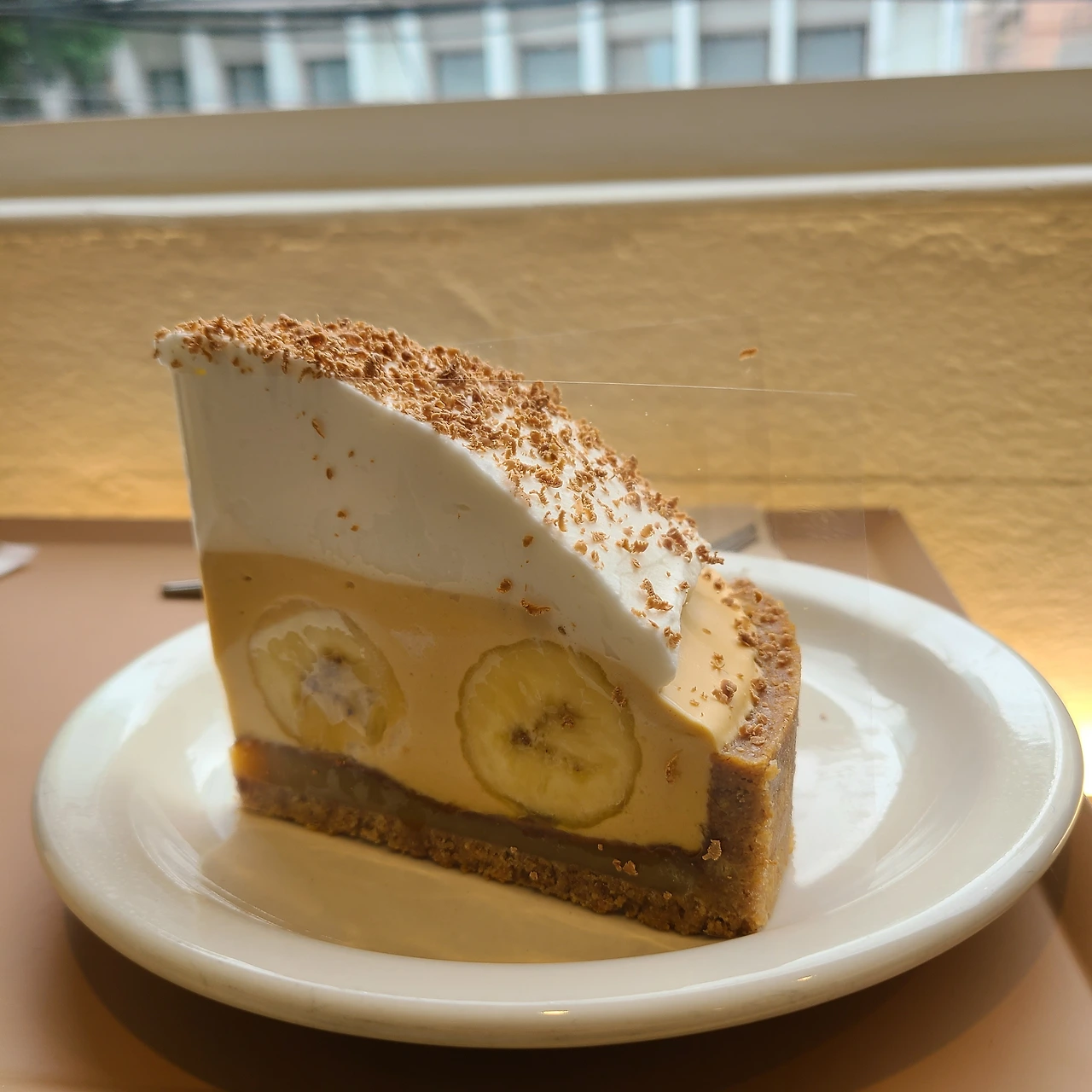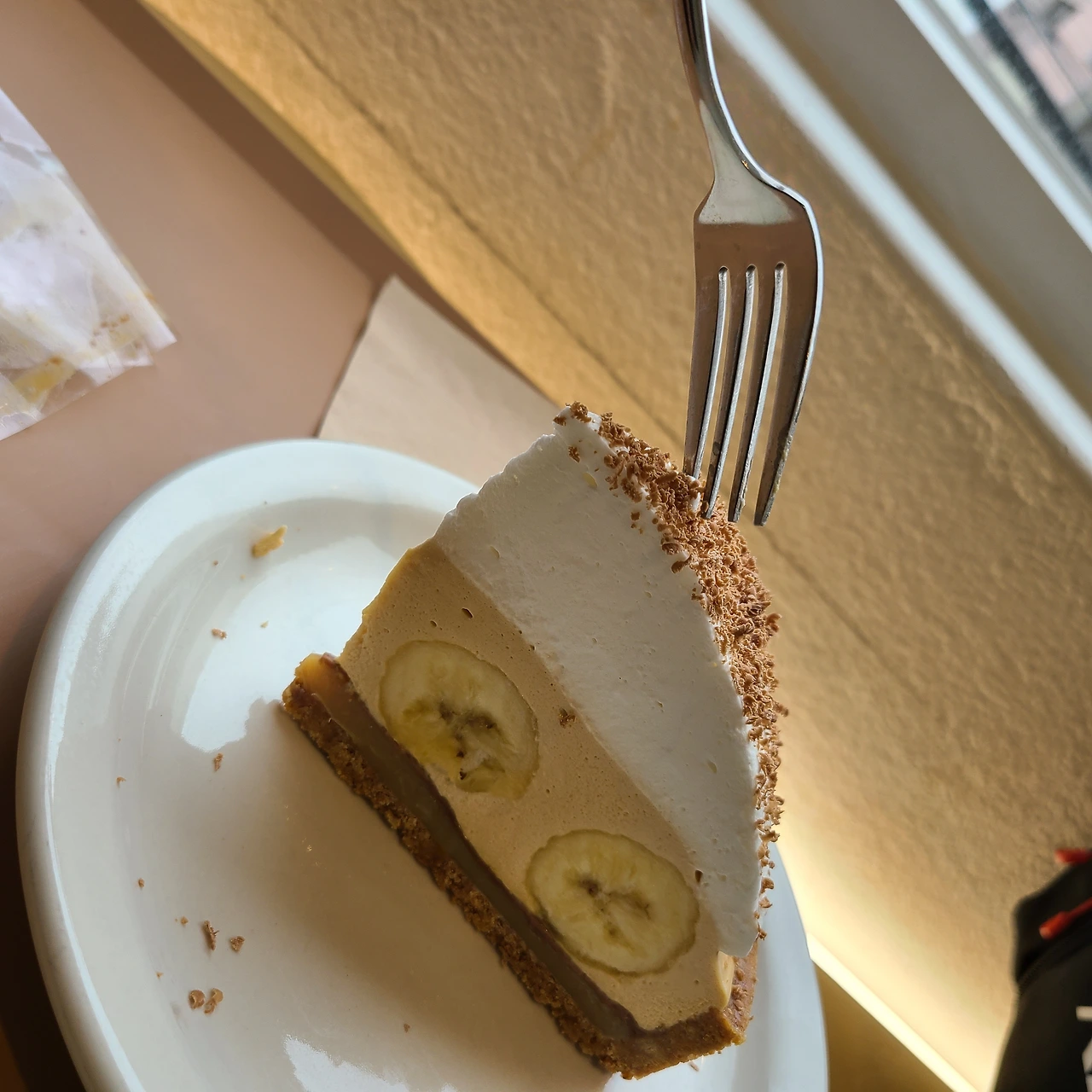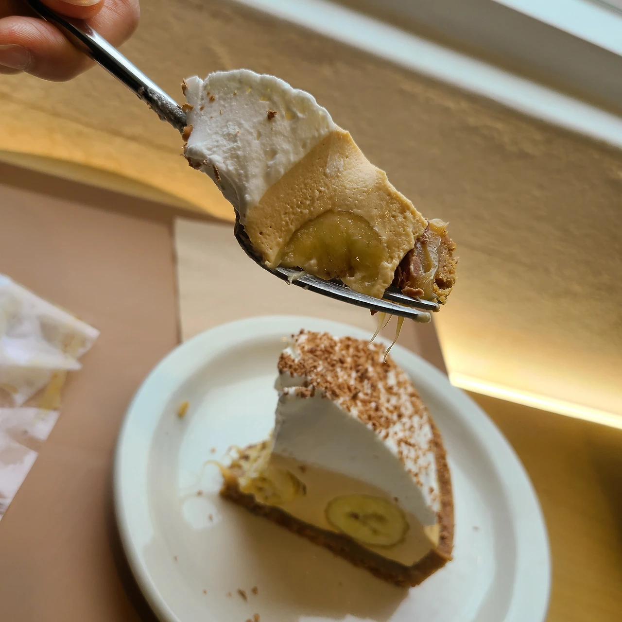 카페 소개에는 뉴질랜드, 호주 스타일 수제 디저트 카페라고 되어있는데 오늘 먹을 '바노피 파이'는 사실 영국의 고전 디저트이다. 잘게 부순 다이제 비스킷으로 만든 파이 틀에 토피, 캐러멜, 바나나, 크림 등을 차곡차곡 쌓아 만든 파이인데, 그 식감이 정말 매력적이다.