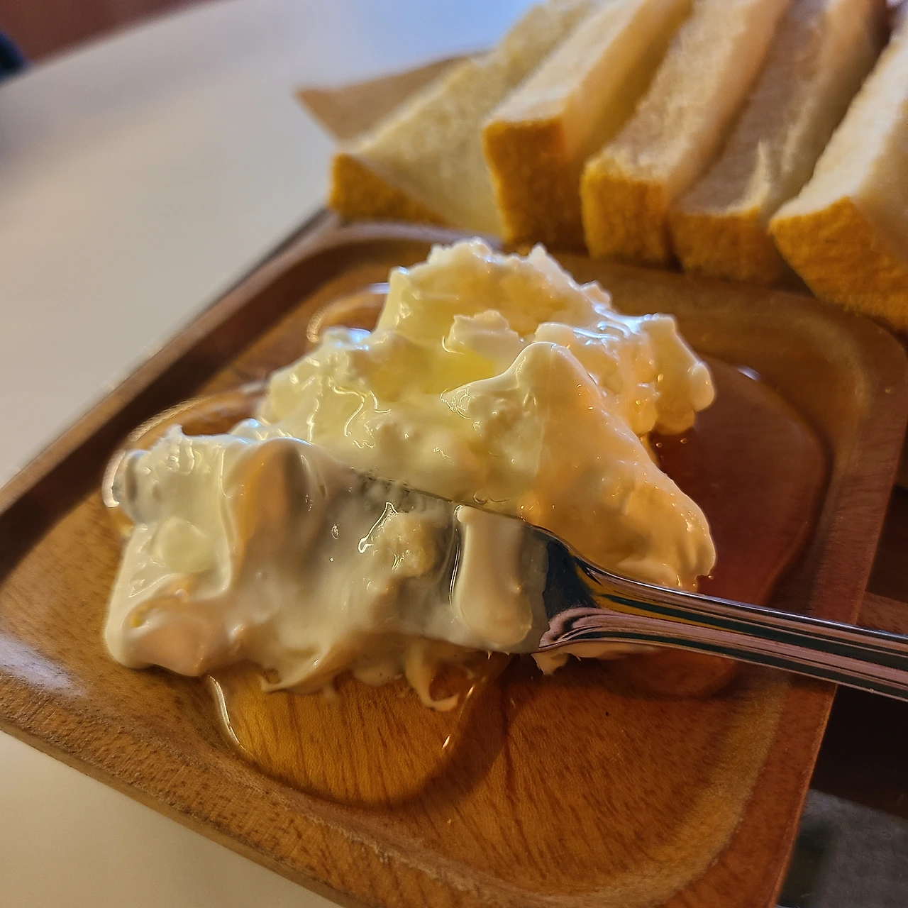 텍스쳐가 약간 가볍고 신선한 느낌이 들긴 했다. 근데 모르는 사람이 먹으면 그냥 생크림에 빵 찍어 먹는 것과 비슷하다고 느꼈을 것 같다.