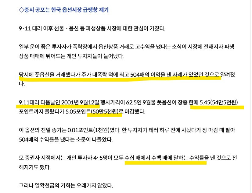 911 테러 직전에 아메리칸 항공(American Airlines)과 유나이티드 항공(United Airlines)의 풋 옵션 거래량이 비정상적으로 증가했다는 보고는, 투자자들이 주가 하락을 예측하고 거래를 했을 가능성을 시사합니다.