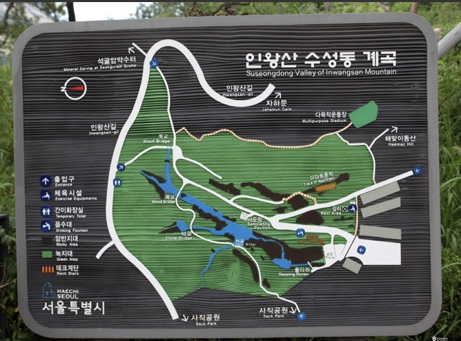 계곡 위로 끝까지 올라가면 인왕산 스카이웨이와 만나고, 큰길 하나를 건너면 인왕산 등산로와 연결된다. 스카이웨이를 따라 올라가면 부암동 '윤동주 시인의 언덕'으로 이어진다. 스카이웨이 아래로 걸어 내려오면 사직공원이 있다. 바로 ‘서울 성곽길’ 인왕산 코스다. 지인과 함께 이 길을 걸으며 오랜만에 향수에 젖어 본다. 옥인아파트는 사라졌지만 다른 건물이 아니라 공원으로 남게 되어 정말 다행이다. 어릴 적 놀았던 계곡이 역사에도 등장하는 수성동 계곡이라는 사실도 알게 되어 무척 기뻤다.