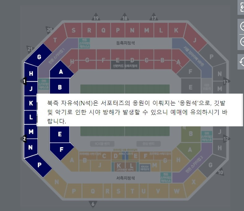 [북측 자유석은 서포터즈의 응원이 이뤄지는 '응원석'으로 깃발 악기로 인한 시야 방해가 발생할 수 있으니 예매에 유의하시기 바랍니다.]