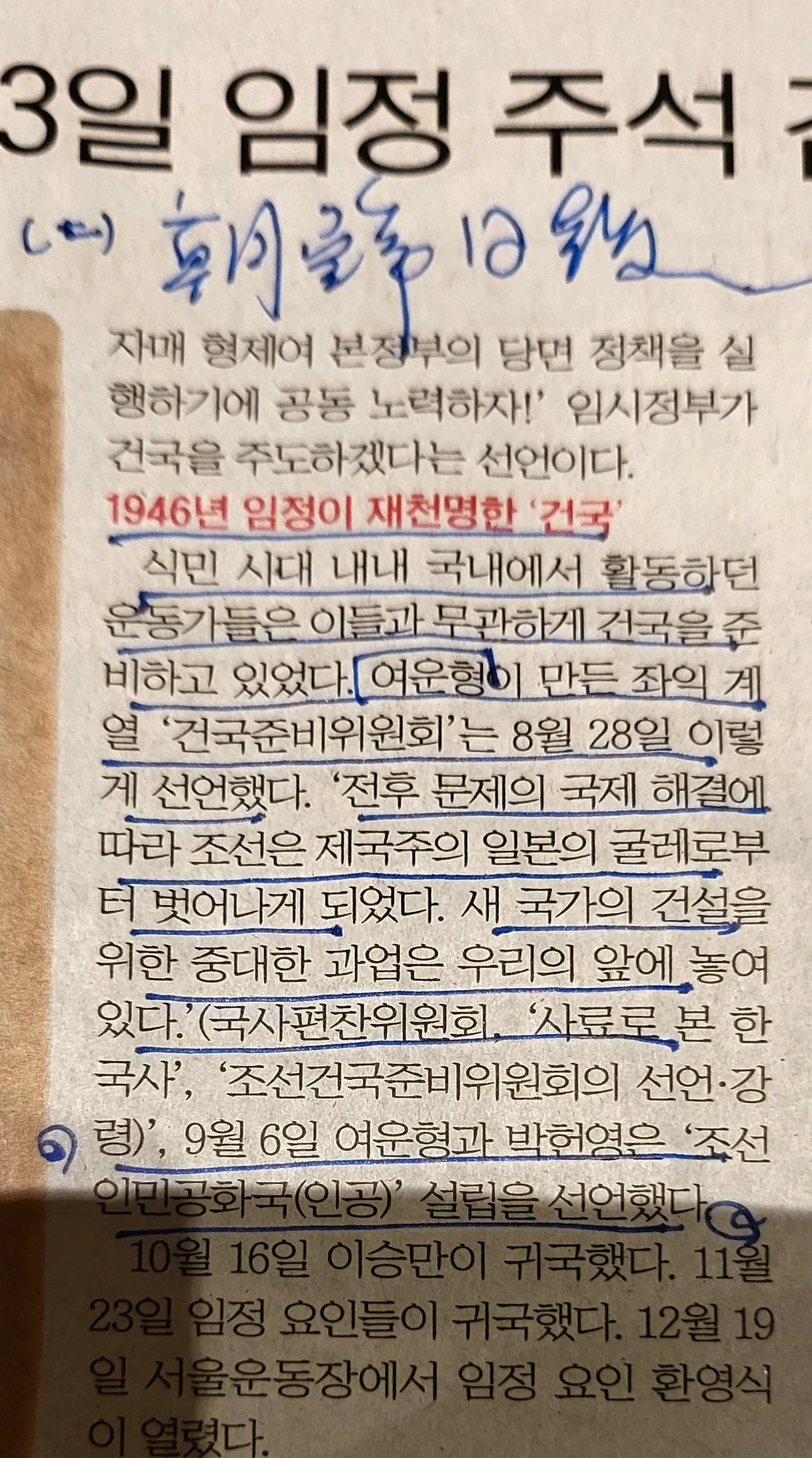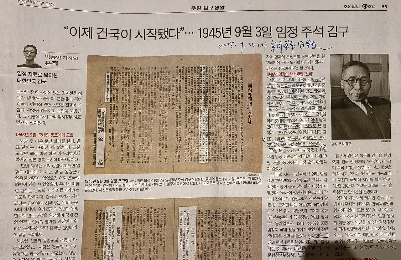 하지만 마침 오늘(2025년 9월 13일) 조선일보 박종인 기자의 '임정자료로 알아본 대한민국 건국' 기사를 보며 마음이 다시 무거워졌다. 1945년 9월 6일 여운형과 박헌영이 '조선인민공화국(인공)' 설립을 선언했다는 내용 때문이다.