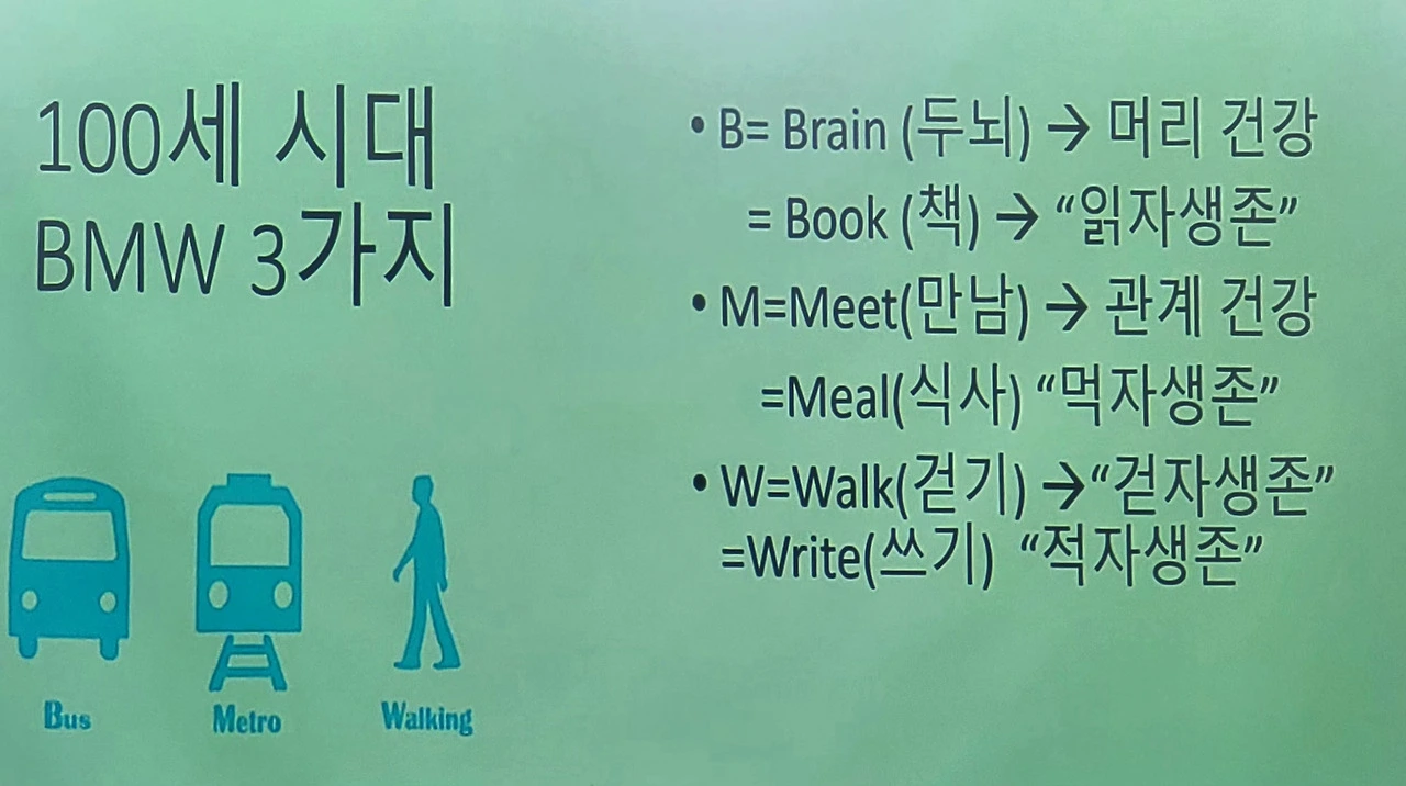그리고 강의 후반, 손 교수는 또 하나의 삶의 지침을 내비게이션처럼 제시했다. 바로 BMW였다. 처음엔 은퇴 후 자가용 키는 완전 금고에 보관하고 버스·지하철·걷기로 생활하는 내 모습에 속으로 미소 지었지만, 교수의 BMW는 훨씬 멋진 의미를 담고 있었다.