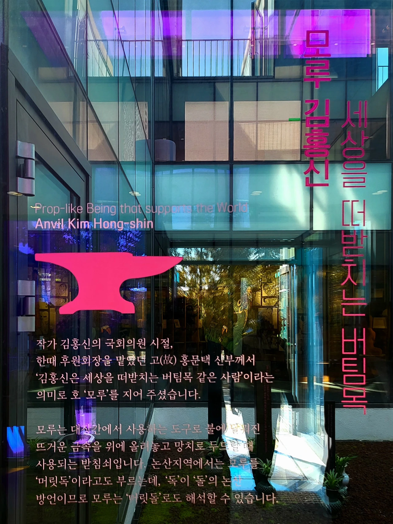 김홍신 작가님께서 문학관과 집필관 속살을 모두 보여주시고 나오는 대로변에서 건물을 바라본다. 매의 눈에는 벽면 중간 가로로 된 공간에 모루 한 척이 늠름하게 장식되어 있다. 마치 대장장이가 철을 녹이듯 대작가님의 만년필이 원고지를 녹이는 듯한 느낌이다.