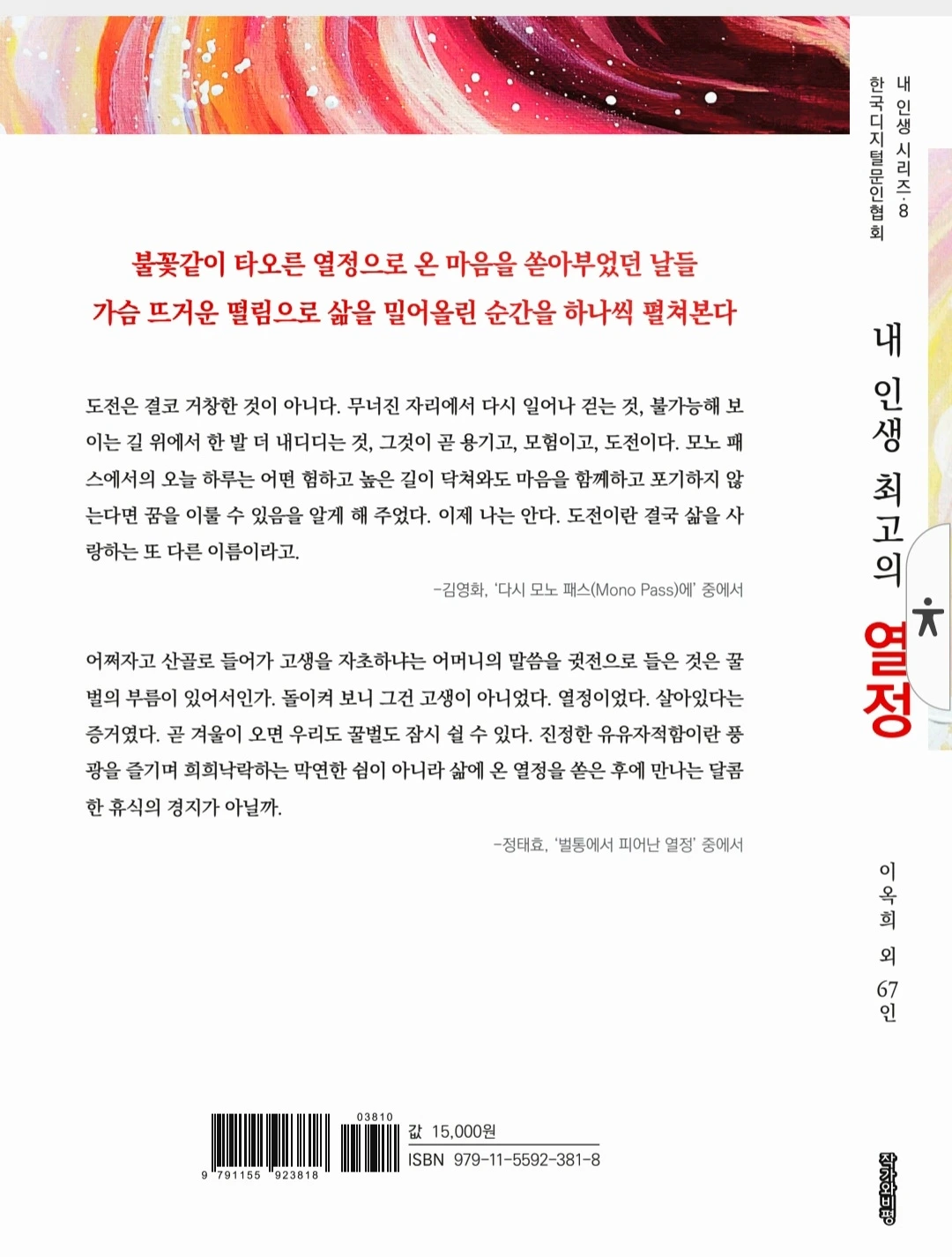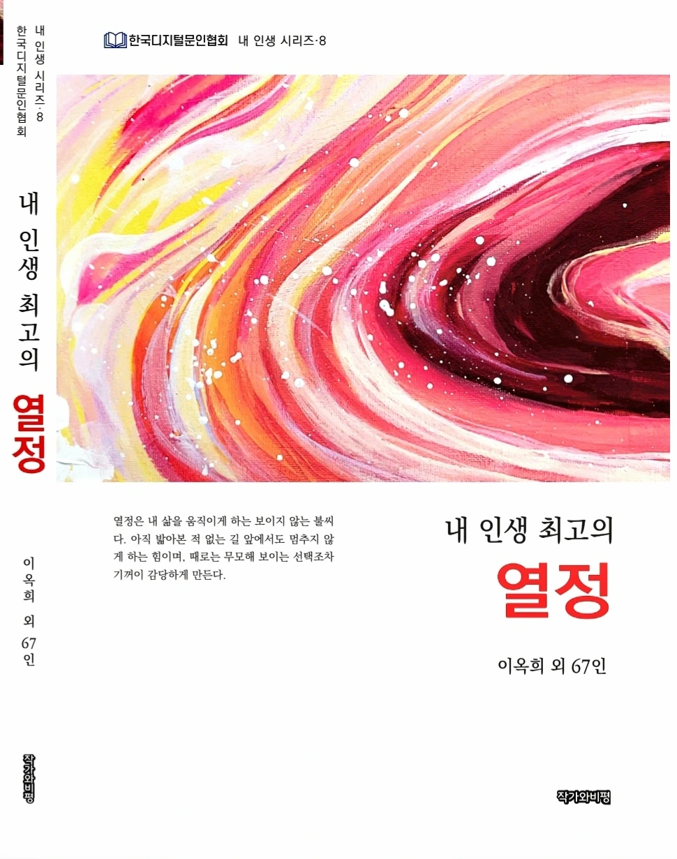 ※ 한국디지털문인협회 "내 인생시리즈, 8번째 내 인생 최고의 열정" 공동문집에 "하늘에서 온 감사문자" 주제 한 꼭지 함께 실었다.