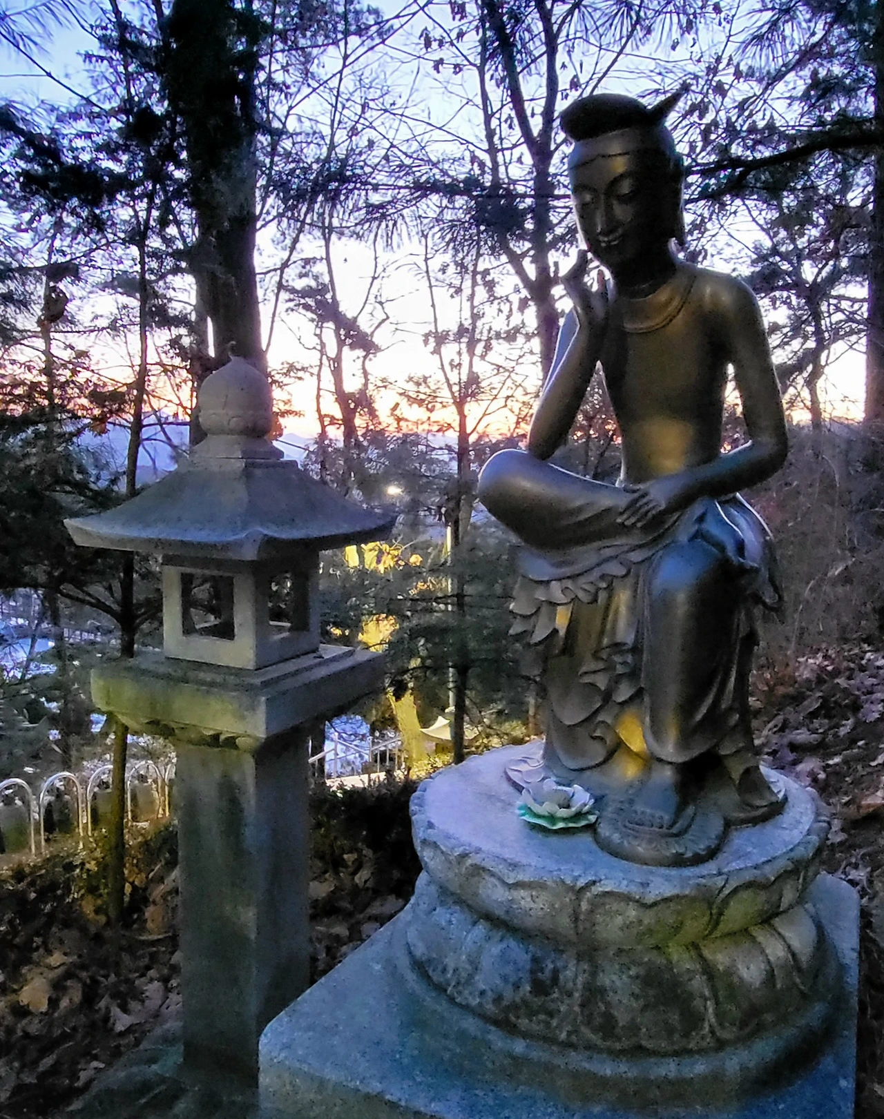 드디어 일출시간 7시 47분, 스님과 나란히 붉은 태양을 맞이했다. 두 손으로 합장하며 태양을 받드니 금빛이 약동했다. 어제 한강에서 보았던 부광약금, 그리고 산사에서 다시 만난 부광약금이었다. 스님의 권유로 커피 후식까지 곁들인 아침 공양 후, 평화의 불 봉송탑을 세 번 돌며 합장했다. 개성공단에서 보낸 이야기, 북한 땅 영통사 복원식과 평양 인근 광법사와 묘향산 보현사 방문 이야기를 나누자 스님은 반갑게 고개를 끄덕이셨다. 스님이 몸소 이루인 평화를 향한 길 위에서 북녘이야기는 자연스레 마음이 겹쳐졌다.