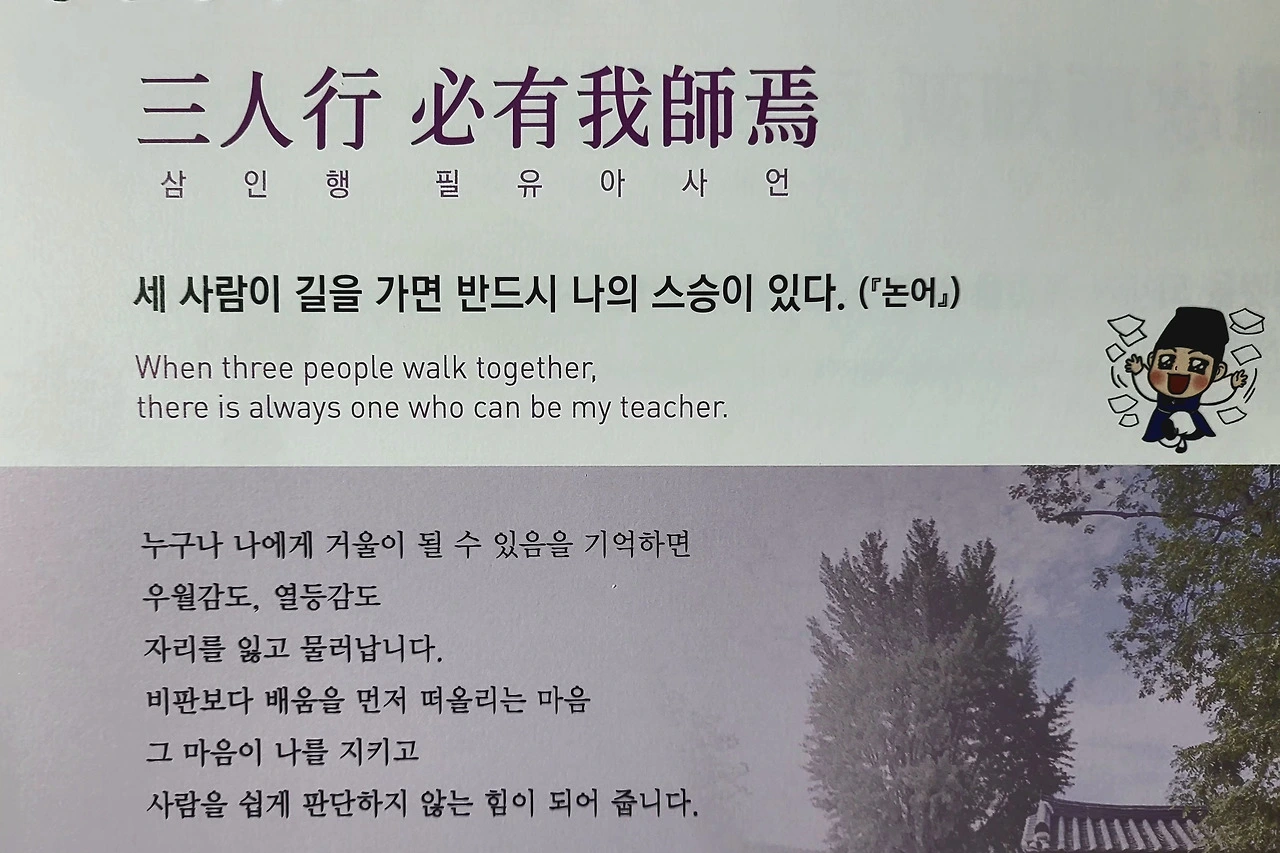 공자가 2,500년 전에 설파한 세 가지 기쁨은 2026년의 서울 한복판에서도 여전히 생동하고 있었다. 배우고(學), 붕우와 교유하며(朋), 군자의 길을 걷는(君子) 것.