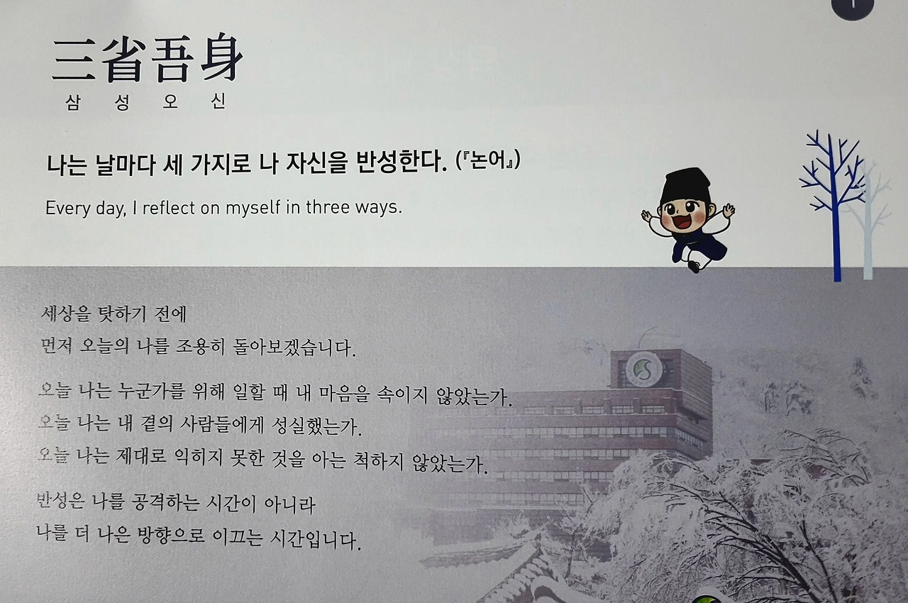 행사를 마치며 우리 손에 쥐어진 선물은 '365일 논어 다이어리'였다. 사무사(思無邪), 삼성오신(三省吾身)... 매일 한 구절씩 성인의 가르침을 새기며 살아가라는 귀한 뜻이 담겨 있었다.