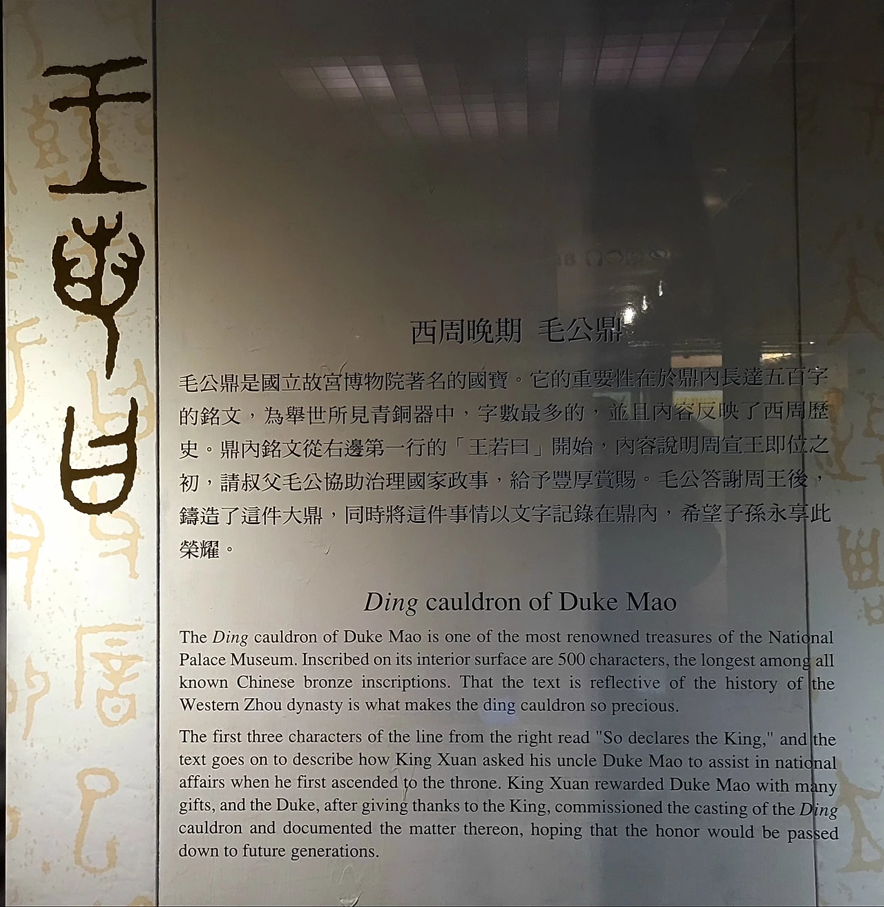 설명 패널에 따르면 명문은 "왕이 이르시기를(So declares the King)"이라는 문구로 시작한다. 선왕(宣王)이 즉위 초 숙부인 모공(毛公)에게 국정을 맡기며 후한 포상을 내렸고 모공은 왕에게 감사하며 이 대정(大鼎)을 주조하여 그 영예를 후손들에게 길이 전하고자 했다는 내용이다.
