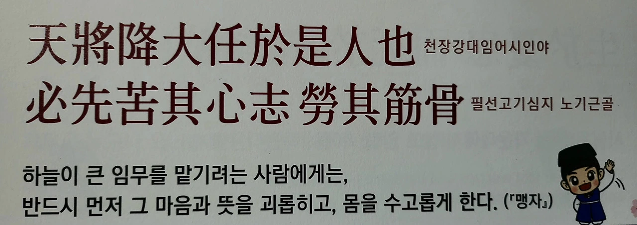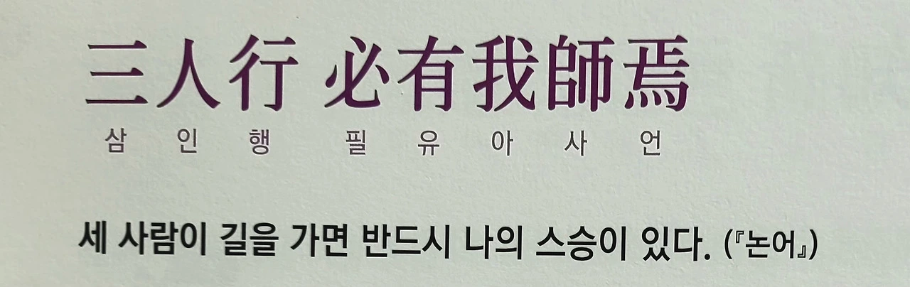 그리고 삼인행필유아사언 택기선자이종지 기불선자이개지(三人行必有我師焉 擇其善者而從之 其不善者而改之), 세 사람이 길을 가면 반드시 나의 스승이 있다. 선한 것은 따르고, 선하지 않은 것은 나를 돌아보는 거울로 삼는다. 누구나 나에게 스승이 될 수 있음을 기억하면, 비판보다 배움을 먼저 떠올리는 마음이 나를 지키는 힘이 되어준다.