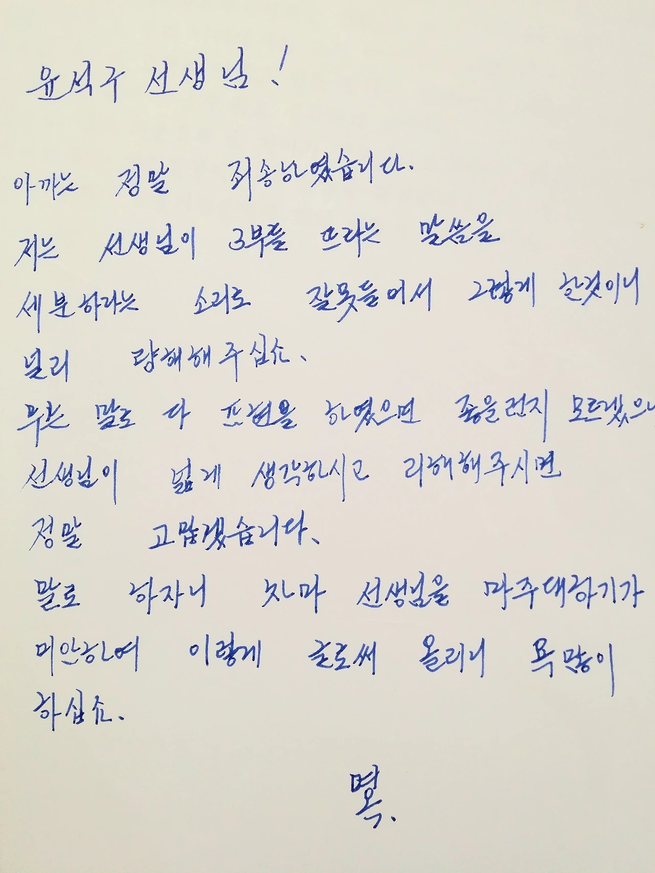 "윤석구 선생님, 아까는 정말로 죄송하였습니다. 저는 선생님이 3부를 뜨라는 말씀을 세분하라는 소리로 잘못 들어서 그렇게 한 것이니 널리 량해 해 주십쇼. 무슨 말로 다 표현하였으면 좋을련지 모르겠으나 선생님이 넓게 생각하시고 리해해 주시면 정말 고맙겠습니다. 말로 하자니 선생님을 마주 대하기가 미안하여 이렇게 글로써 올리니 욕 많이 하십쇼. 명옥"