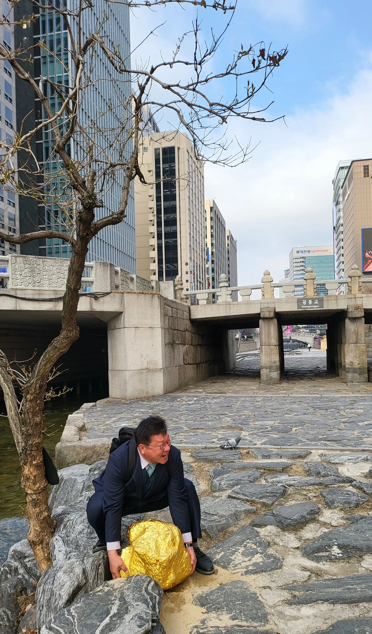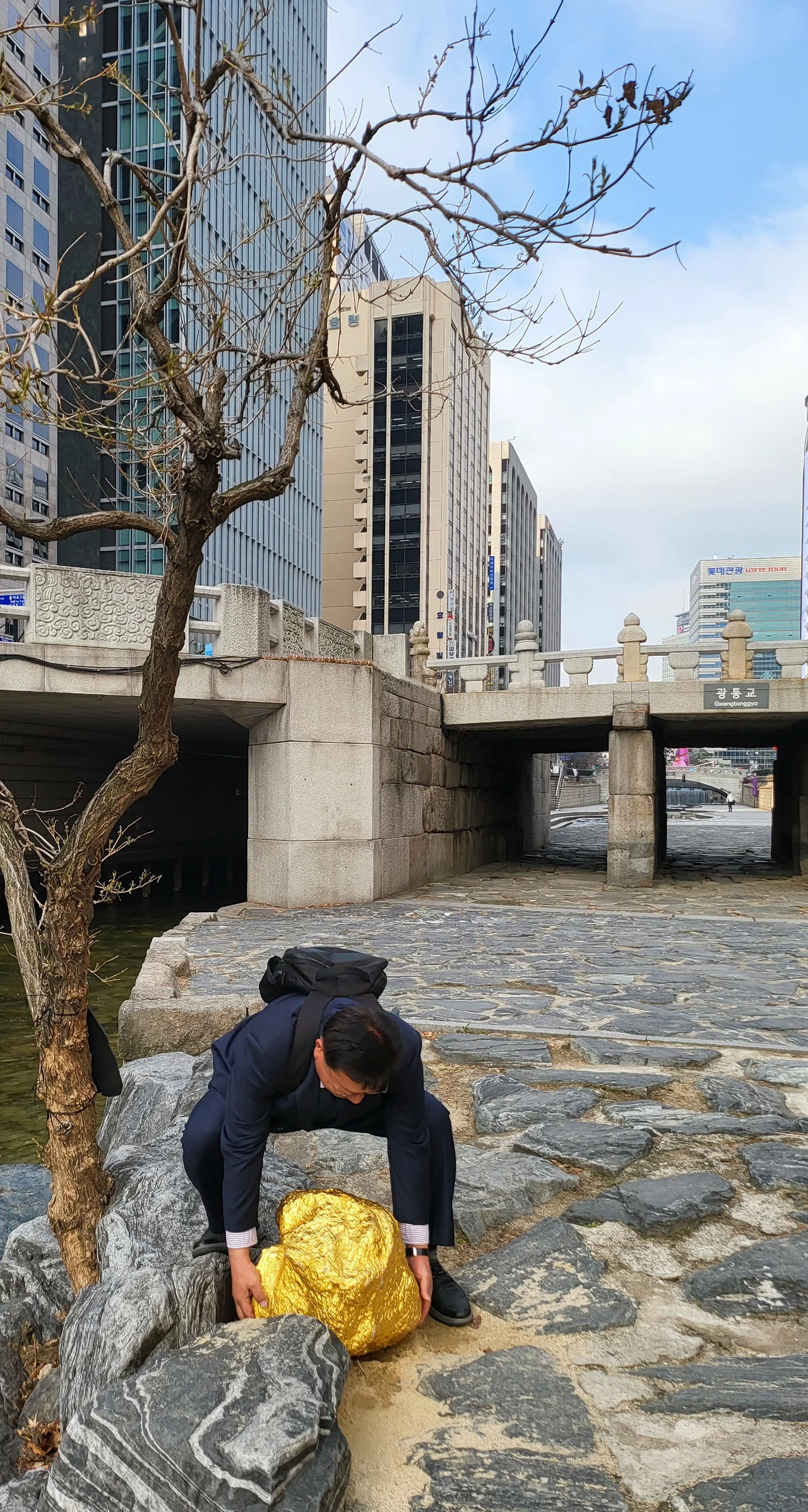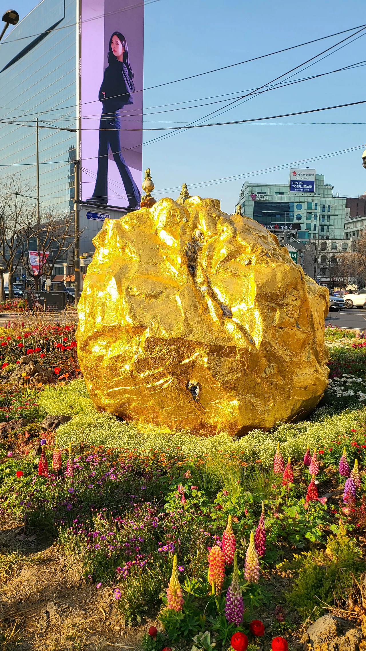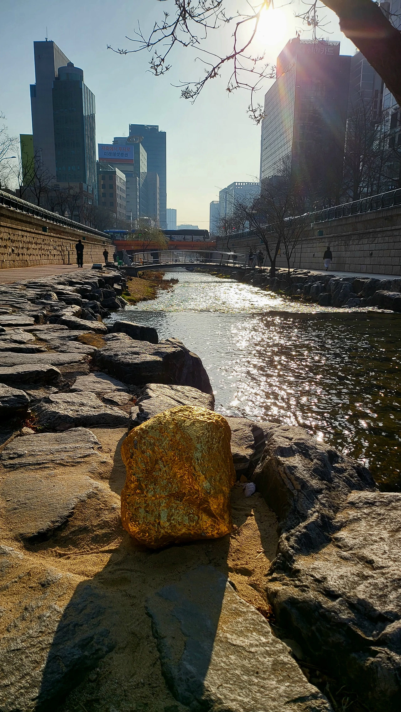 설레는 첫 출근길, 광화문 광장 앞 하차 후 청계천 광통교 아래에서 믿기지 않는 광경을 목격했다. 눈부신 햇살을 받아 영롱하게 빛나는 커다란 황금 바위가 나를 반기는 게 아닌가. 덥석 그 금덩이를 들어 올리는 모션속에 호탕하게 웃어보았다. 버들피리 새순 돋는 춘삼월 봄날, 대지가 내게 건네는 축복이자 앞으로 펼쳐질 나날에 대한 길조 라 생각하니 발걸음이 가벼웠다.