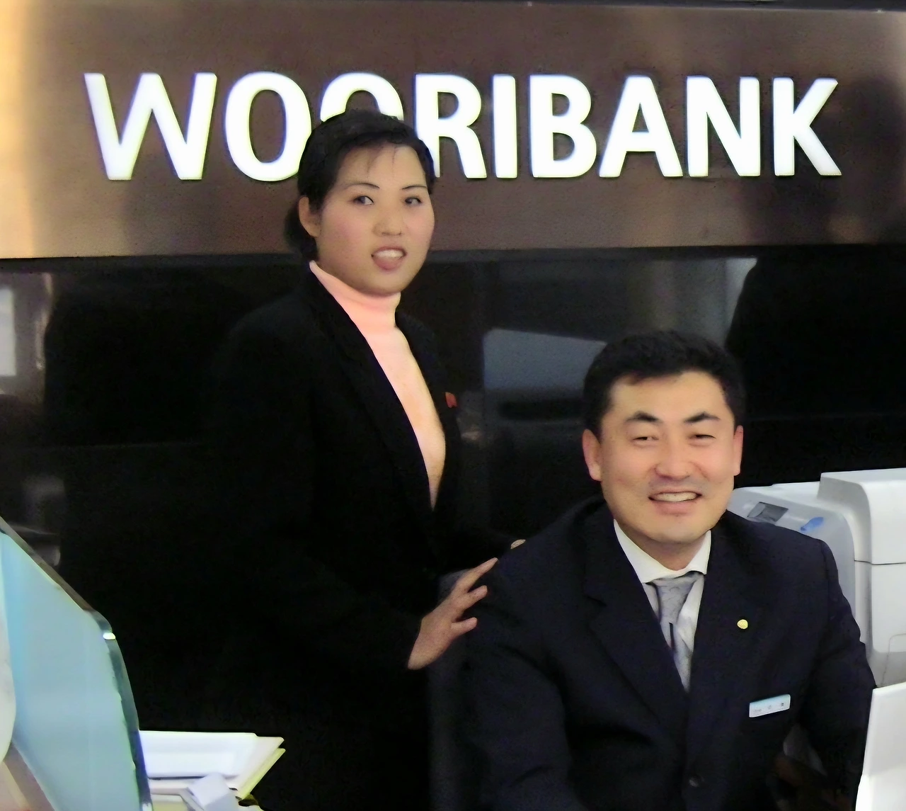 개성공단지점 초기 직원들, 좌로부터 북측 김명옥 행원, 안열차장, 김기홍지점장, 필자