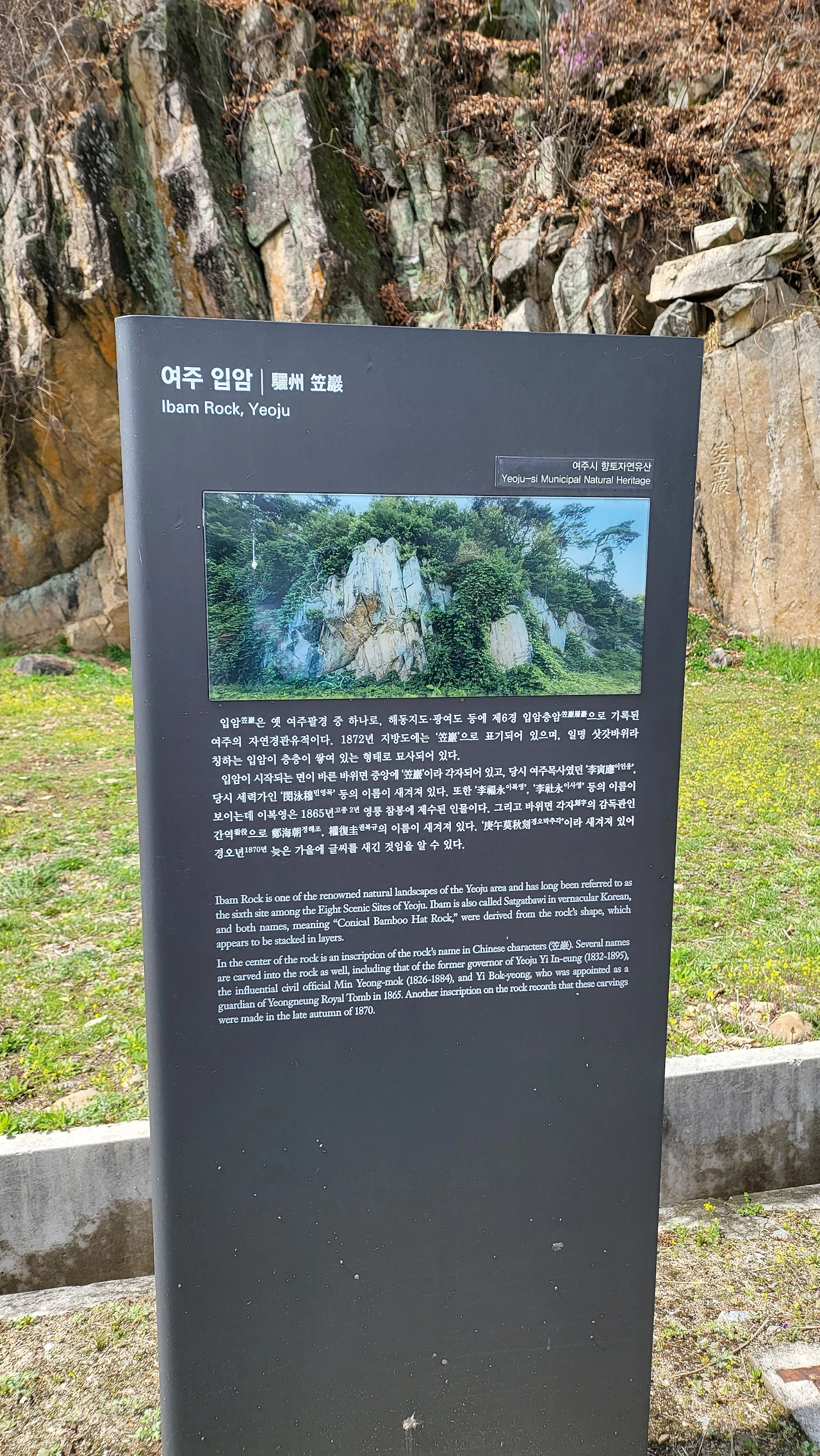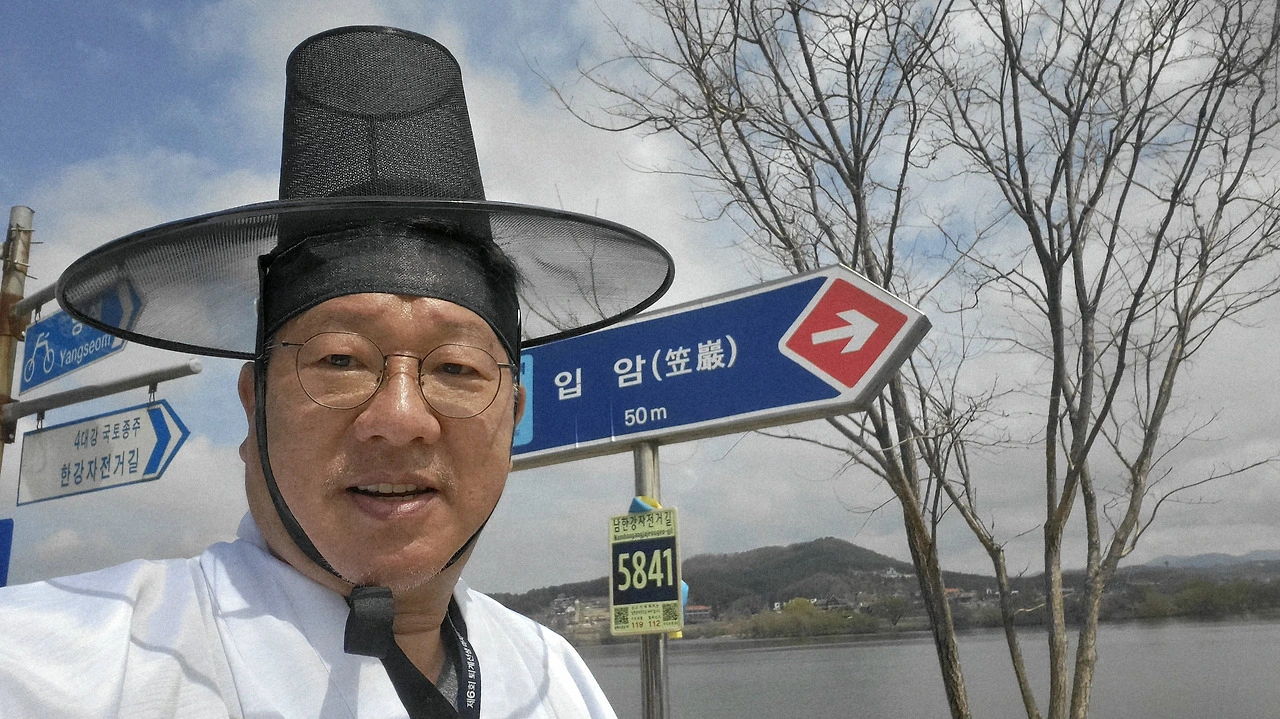 입암을 배경으로 인증샷을 찍었다. 한복 도포 자락을 여미고, 갓을 쓴 채로. 삿갓바위 앞에 선 갓 쓴 사람, 묘하게 어울린다 싶었다.