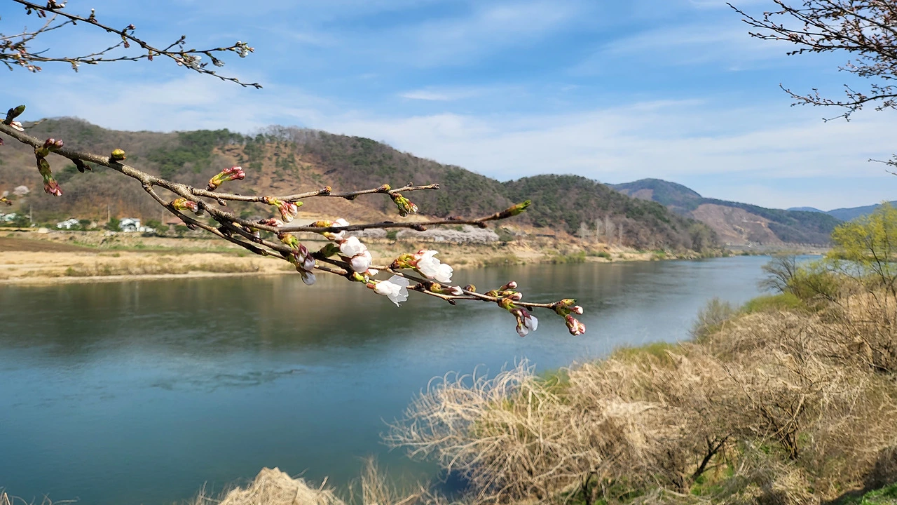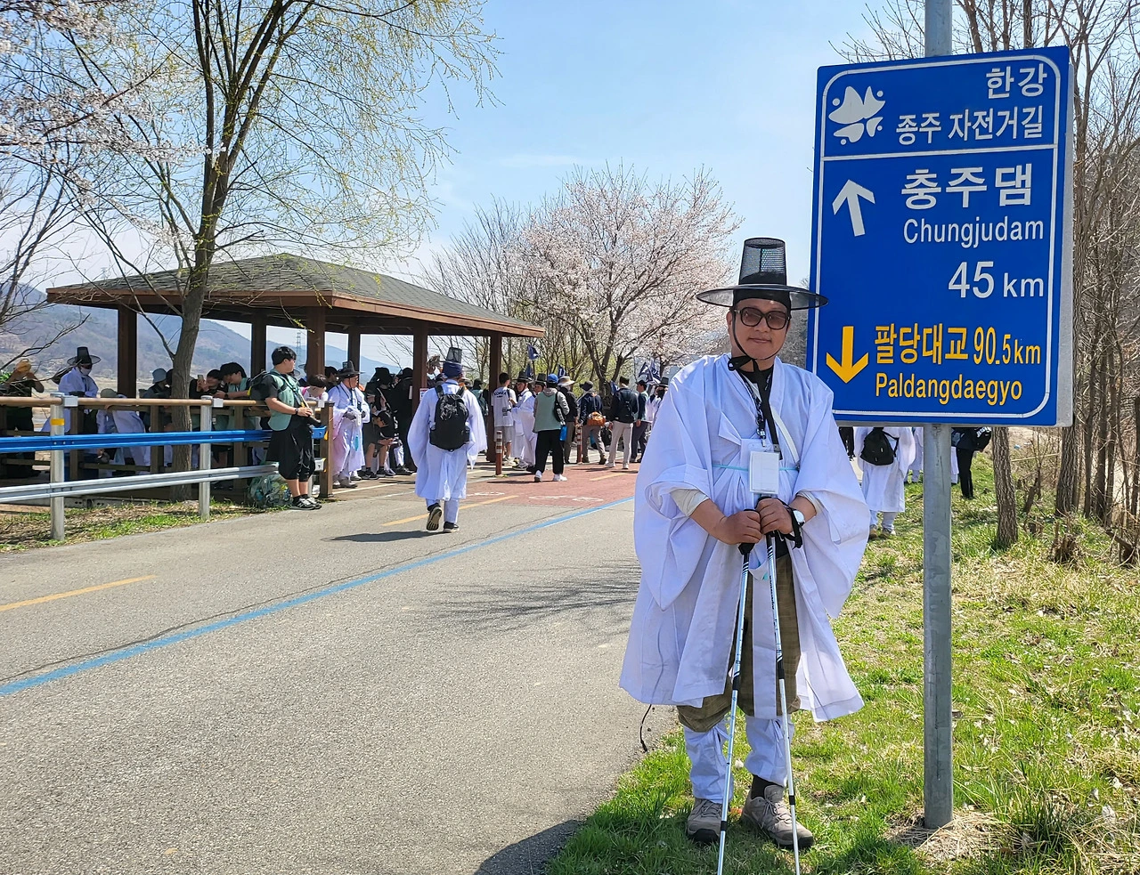 뚝방길 어느 쉼터에 잠시 멈춰 섰다. 이정표가 눈에 들어온다. 충주댐 45km, 팔당대교 90.5km. 우리가 걸어온 길과 앞으로 걸어갈 길이 숫자로 담담하게 적혀 있다. 벚꽃이 흐드러지게 피어 재현단을 환영한다.