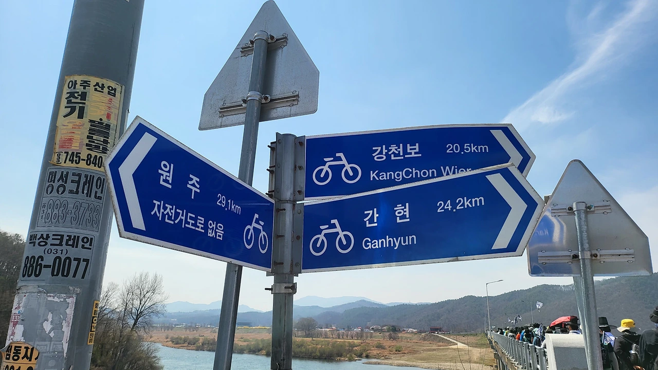 이정표가 눈에 들어온다. 원주 29.1km 자전거도로 없음, 강천보 까지 20.5km, 간현 24.2km. 우리가 걸어온 길과 앞으로 걸어갈 길이 이정표 하나에 고스란히 담겨 있다.