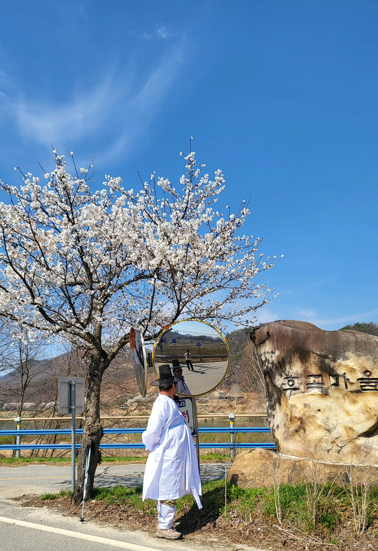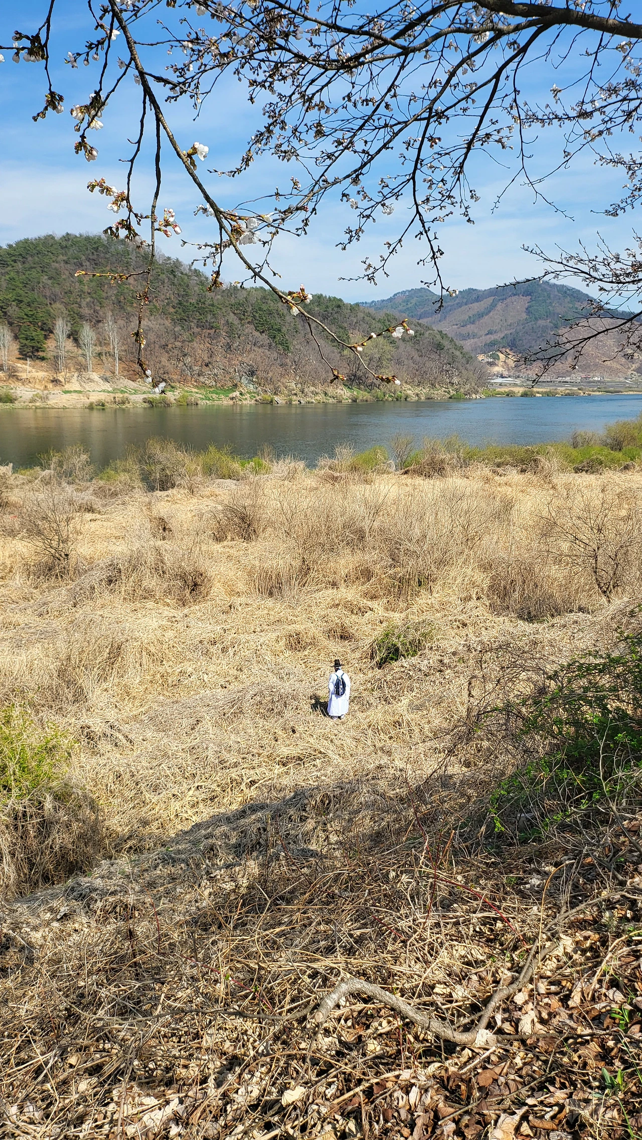 강변 갈대밭 한가운데 흰 도포 자락이 점 하나처럼 서 있다. 위로는 벚꽃 가지가 드리우고, 앞으로는 남한강이 유유히 흐르고, 사방은 마른 갈대밭이다. 어느 유생이 홀로 강을 바라보고 있다. 퇴계 선생은 아니신지, 선생은 그럴분이 아니시다. 아니면 그 길을 따라 걷는 21세기의 유생인가.