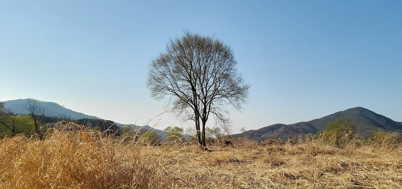 갈대밭 한가운데 홀로 선 나무 한 그루. 앙상한 가지를 하늘로 뻗은 채 산을 배경으로 묵묵히 서 있다. 오랜 세월 온갖 풍상을 다 겪고 수천 번의 계절을 이어온 그 모습에서 또다시 고향집 생각이 되살아난다.
