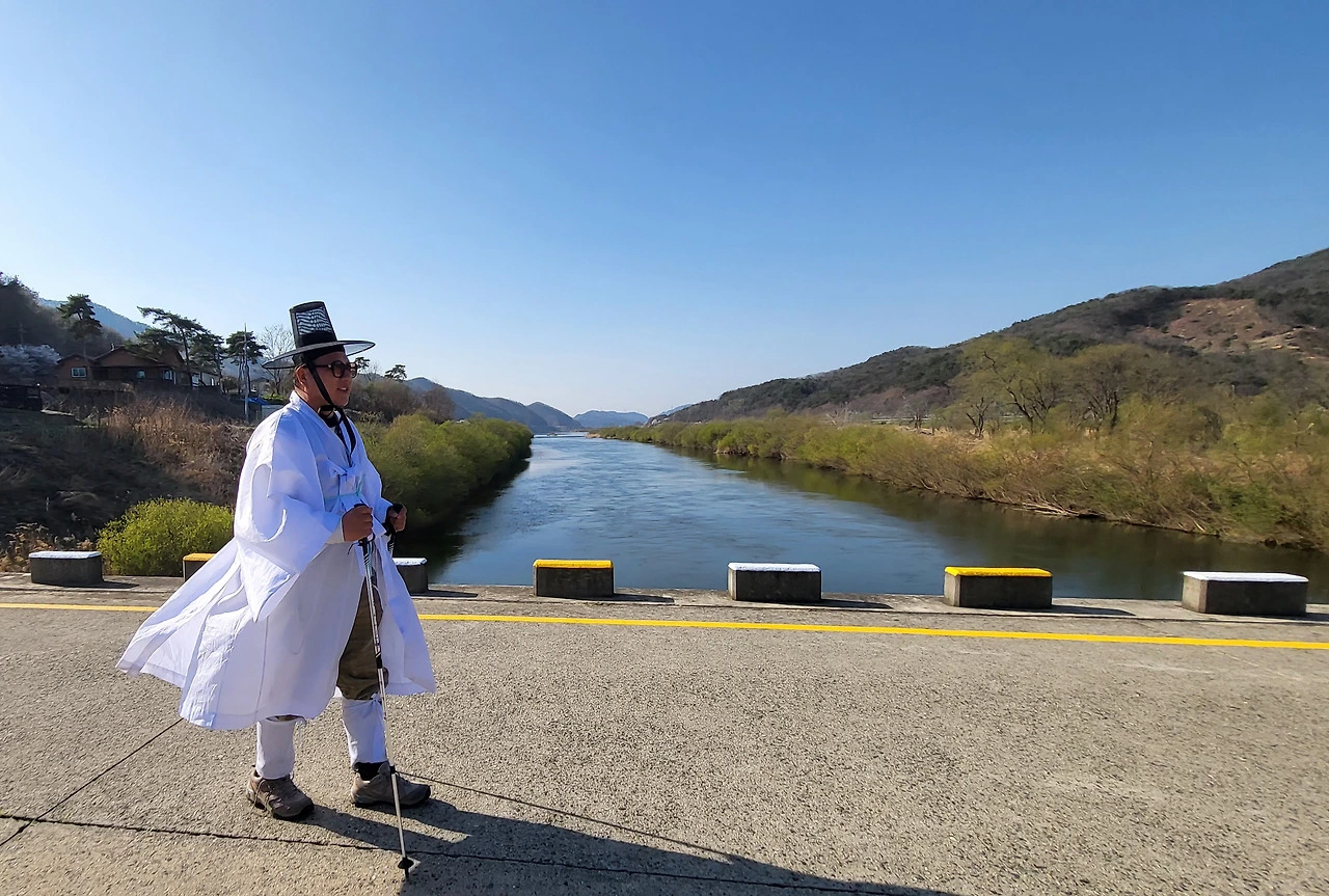 나무다리 위에서 셀카를 찍었다. 양쪽으로 앙상한 나뭇가지들이 터널처럼 드리워진 길, 이것이 바로 '힐링의 터널'이었구나. 뒤로 흰 도포 자락의 또 다른 유생이 걸어온다. 21세기의 선비 둘이 비내섬 나무다리 위에서 마주쳤다. 퇴계 선생, 이 모습을 보고 계십니까.
