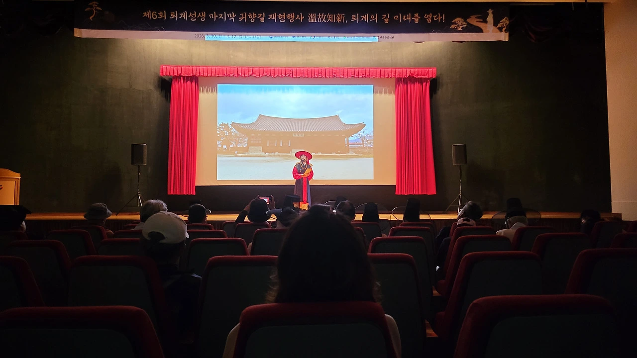 강당 안으로 들어서니 먼저 가야금 삼중주가 울려 퍼졌다. 한복 차림의 세 연주자가 나란히 앉아 가야금 세 곡을 연주했다. 무대 뒤 스크린에는 '제6회 퇴계선생 마지막 귀향길 재현행사'라는 글자와 함께 산수화 속 선비의 실루엣이 떠 있었다. 하루 종일 발로 걷고 귀로 듣고 눈으로 담아온 충주의 하루가 가야금 선율 속에 차분히 가라앉았다.