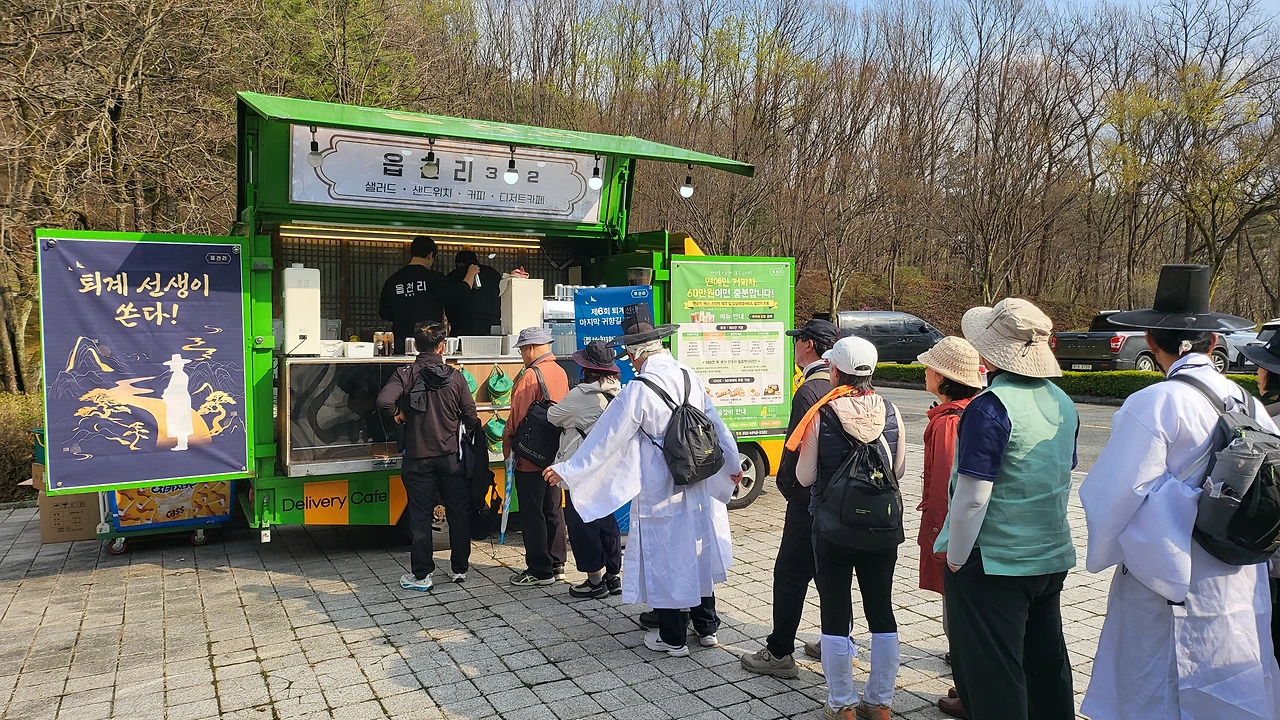 숙소 입구에 초록 커피 트럭이 서 있었다. 현수막에 적힌 문구가 눈길을 끌었다. '퇴계 선생이 쏜다!' 피식 웃음이 났다. 당시라면 커피 대신 녹차였겠지만, 오늘은 퇴계 선생 덕분에 커피 한 잔을 얻어 마시는 셈이었다. 지친 발걸음에 따뜻한 한 잔이 스며들었다.