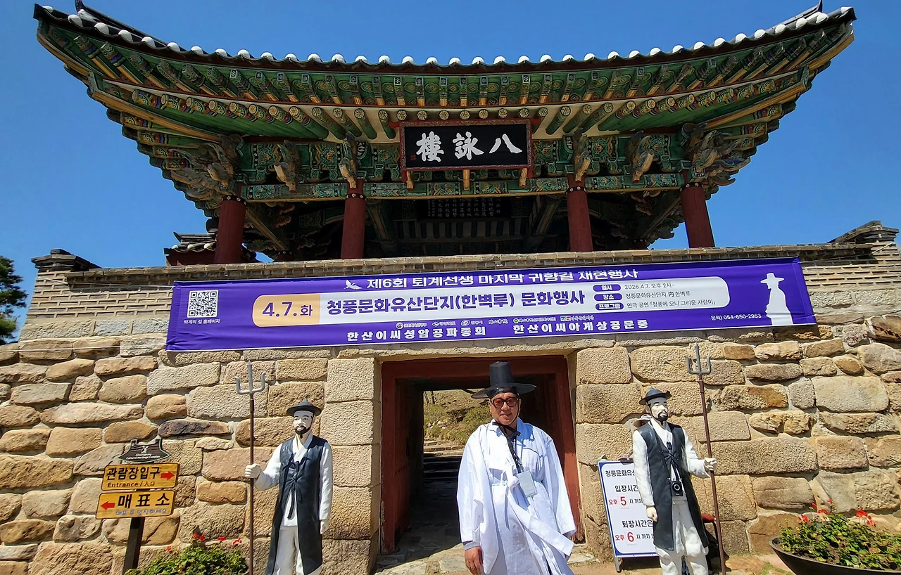 김병일 원장님이 한벽루 앞에 서셨다. 1569년, 퇴계 선생은 가흥까지 관선(官船)을 타고 오신 뒤 충주에서 말을 타고 이곳 청풍에 이르셨다. 당시 청풍군수 성암 이지번(李之蕃)은 퇴계 선생보다 7살 연하였다. 퇴계 선생이 도학을 권하였고 선조 즉위 후 퇴계 선생의 천거로 청풍군수로 나아가 선정을 베풀었다. 특히 남달리 효심이 깊고 학문이 뛰어났으며 천문과 지리에도 밝았다. 벼슬을 내려놓고 고향으로 돌아가는 길에 성암을 만나 마음을 나누셨으니, 그 만남이 얼마나 각별했겠는가. 오늘 이 자리의 행사 제목이 "청풍에 온 그리운 사람"인 까닭이 바로 거기에 있었다.