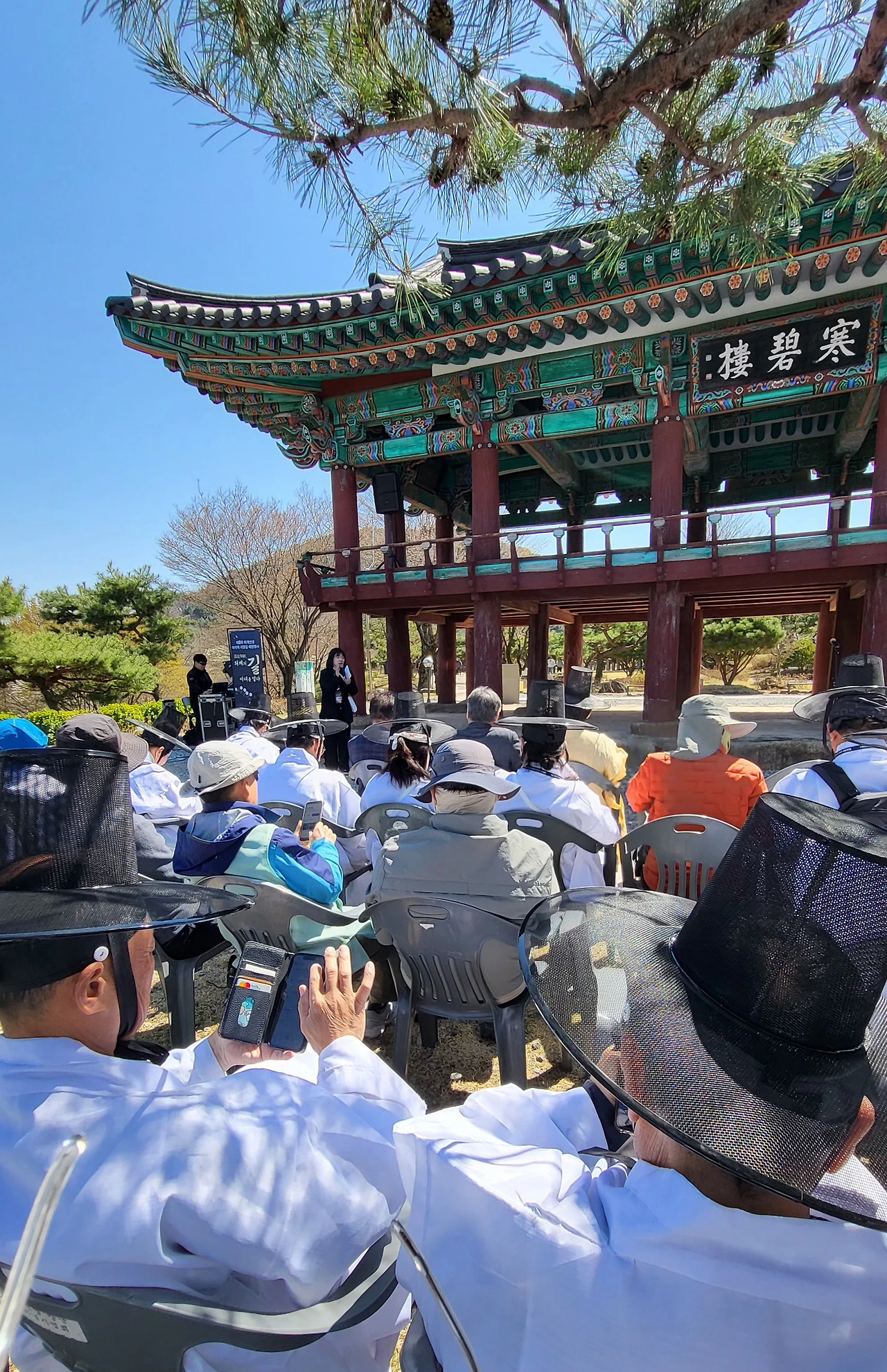 강연과 연극이 끝나고 처음으로 단체사진을 찍게 되었다. 한벽루 아래 마당은 비좁고 협소하여 일부는 누각 위로 올라가 촬영에 응했다.
