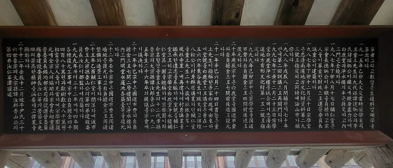 선현들이 누각에 남긴 현판 하나, 돌에 새긴 글자 두 자. 그것이 수백 년을 건너 오늘 이 자리에서 후손의 가슴을 울린다. 한벽루 위에서 퇴계 선생의 시판을 올려다보며, 나는 노성 종학당 정수루의 반호 선조를 동시에 떠올렸다. 누각은 그렇게, 시간을 초월한 만남의 공간이었다.