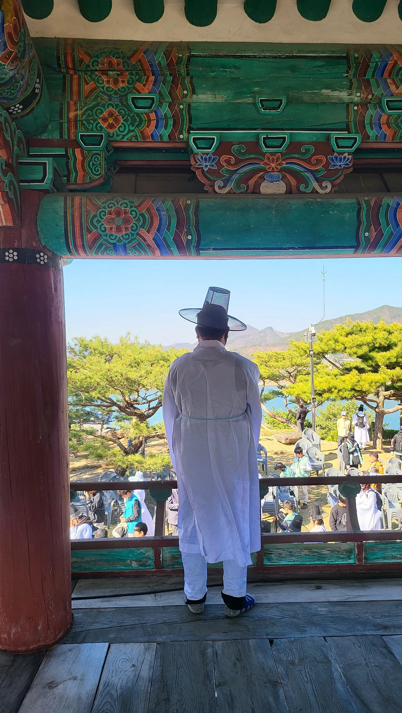 사실 누각에 오르게 된 데에는 또 하나의 인연이 있었다. 강연이 시작되기 전, 내가 앉은 의자 위로 멋지게 늘어진 솔방울 다섯 개 달린 가지 하나가 툭 하고 내 무릎 위로 떨어졌다. 하늘에서 천사의 편지가 또 왔구나 싶었다. 그 덕분이었을까. 단체사진을 찍으러 누각에 올랐다가 뜻밖의 보물을 만나게 되었다.